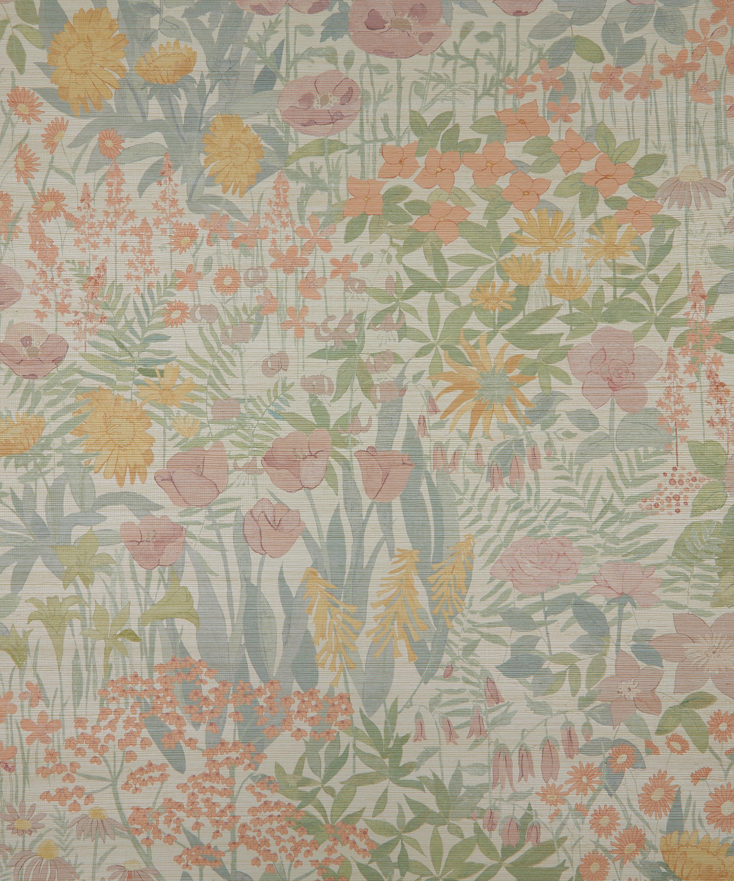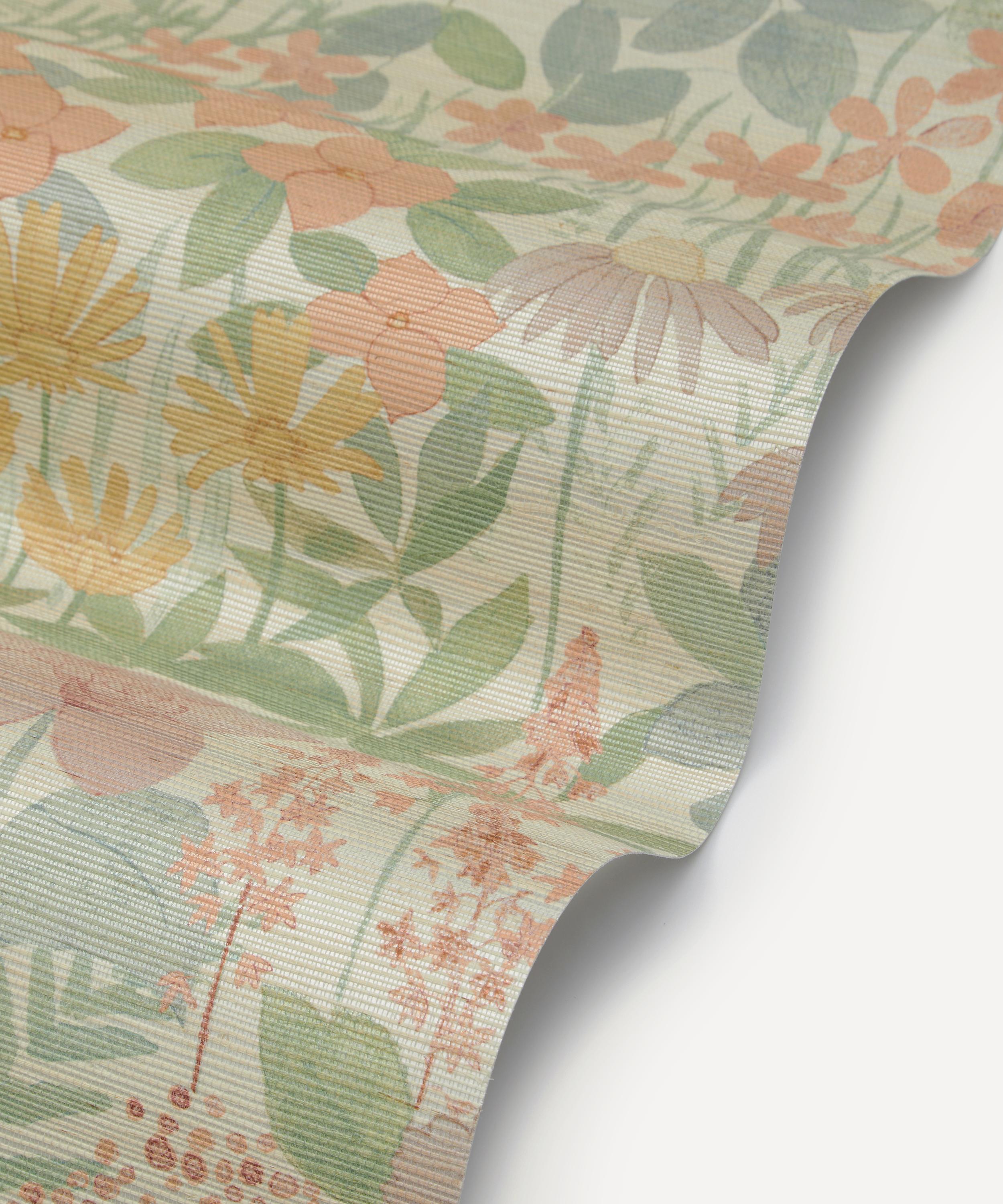 Faria Flowers Wallpaper is a wonderfully textural pattern, inspired by a collection of botanical sketches hand-painted on location at Hampton Court Palace. Enchanting spring flowers such as poppies, roses, dahlias, hydrangeas, daisies, bluebells, and tulips, burst into life in two contrasting colourways, evoking the vibrant beauty of a sunlit meadow in full bloom. Printed on a pearlescent grass-cloth base, the outcome is a richly textured wallpaper with a subtle sheen.