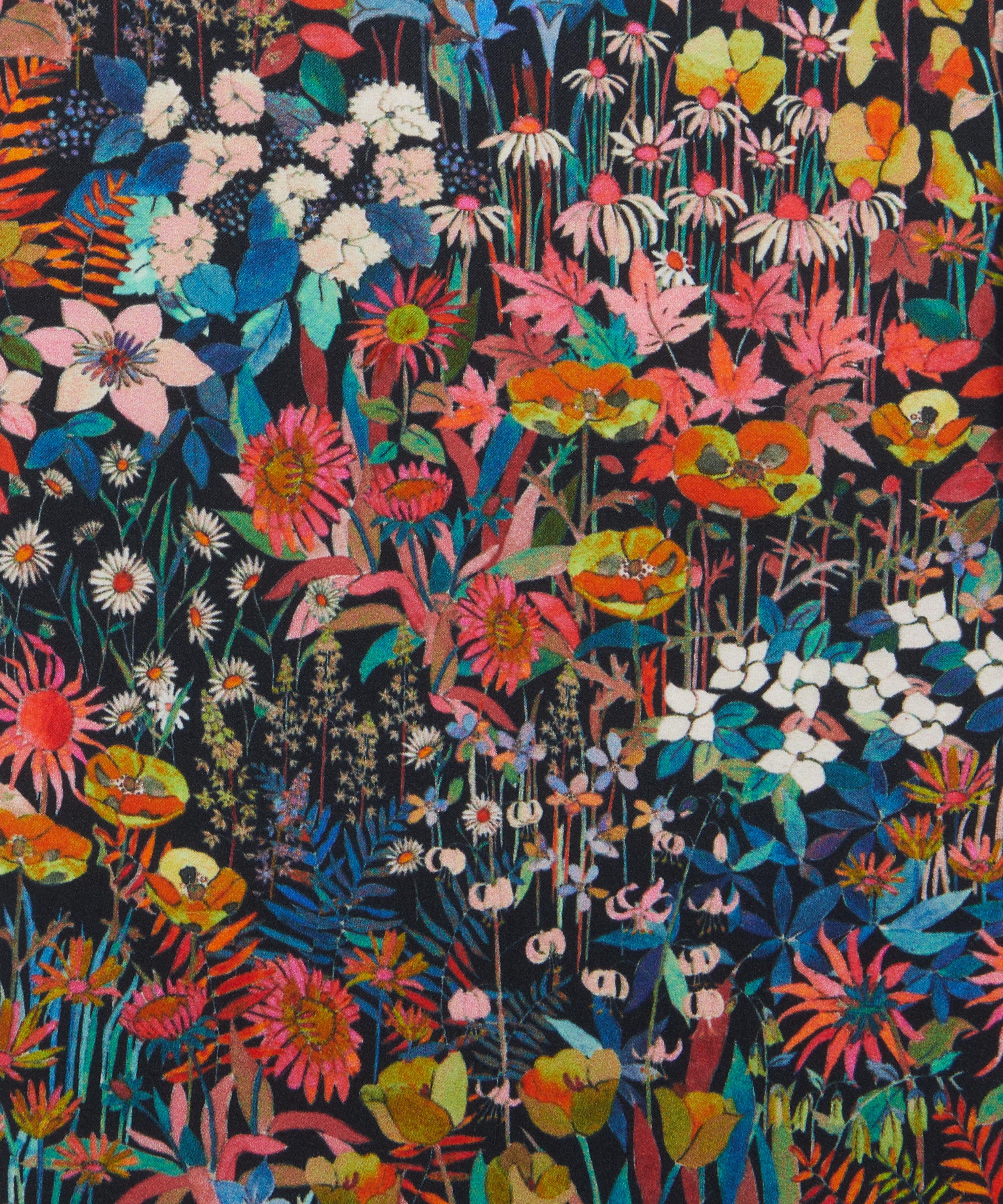 Faria Flowers Small is a hand-drawn and hand-painted floral design, drawn from studies taken at the Royal Chelsea and Hampton Court by our Liberty Fabrics designers. Gorgeous blooms can be seen growing out from mainly dark blotches, representing the earth and showcasing the garden at the height of its splendour and glory.