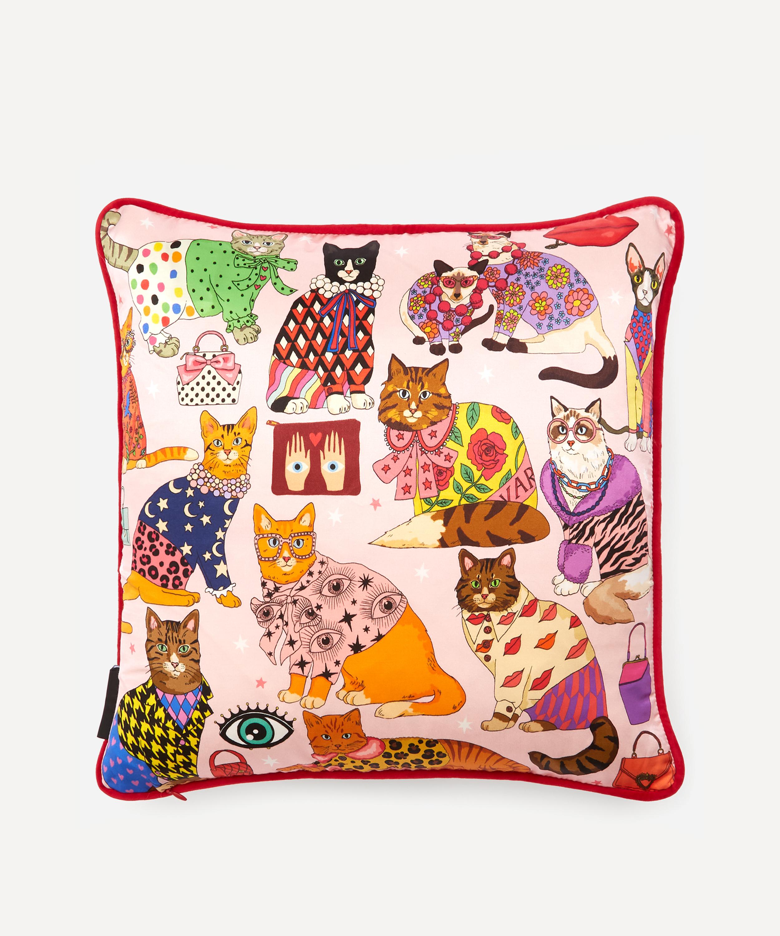 Known for her imaginative designs, which depict pastel sweet themes with a slightly hallucinatory edge, Karen Mabon brings her artful illustrations to this square cushion. Crafted from a premium blend of Mulberry silk and cotton, it depicts cats dressed up in style-savvy outfits against a soft pink background. Use it to add an extra dash of character to a favourite velvet sofa or patterned armchair.