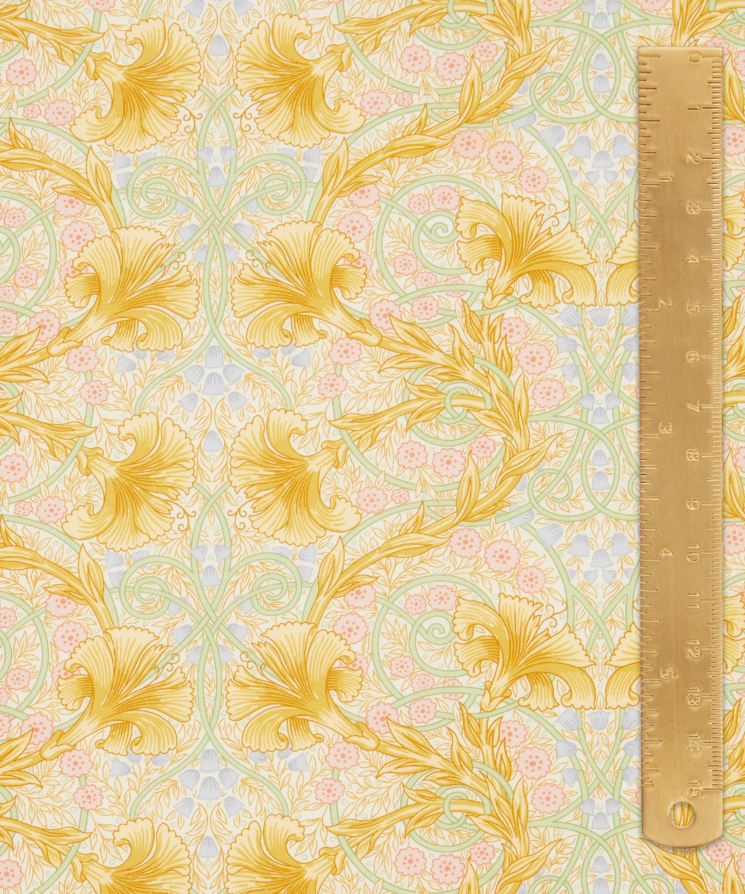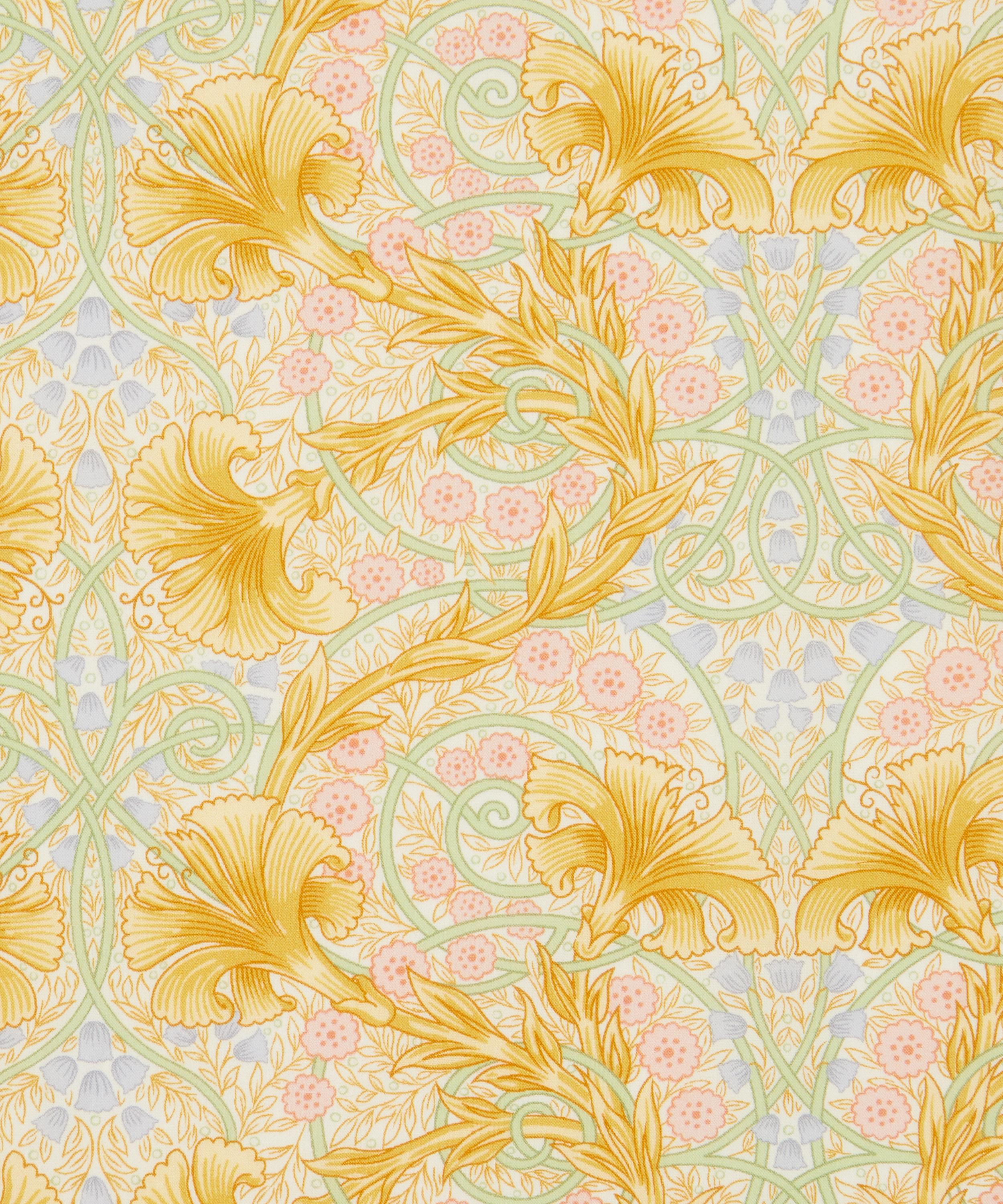 Originally created by artist and embroiderer, Katie Faulkner, who was associated with the British Arts and Crafts movement, this artwork has been reworked by the Liberty design studio for contemporary aesthetics. Interlacing carnations appear in a mirrored trail, traditional to the artistic movement, populated further with small blossoming flower heads and subdued leafy vines.