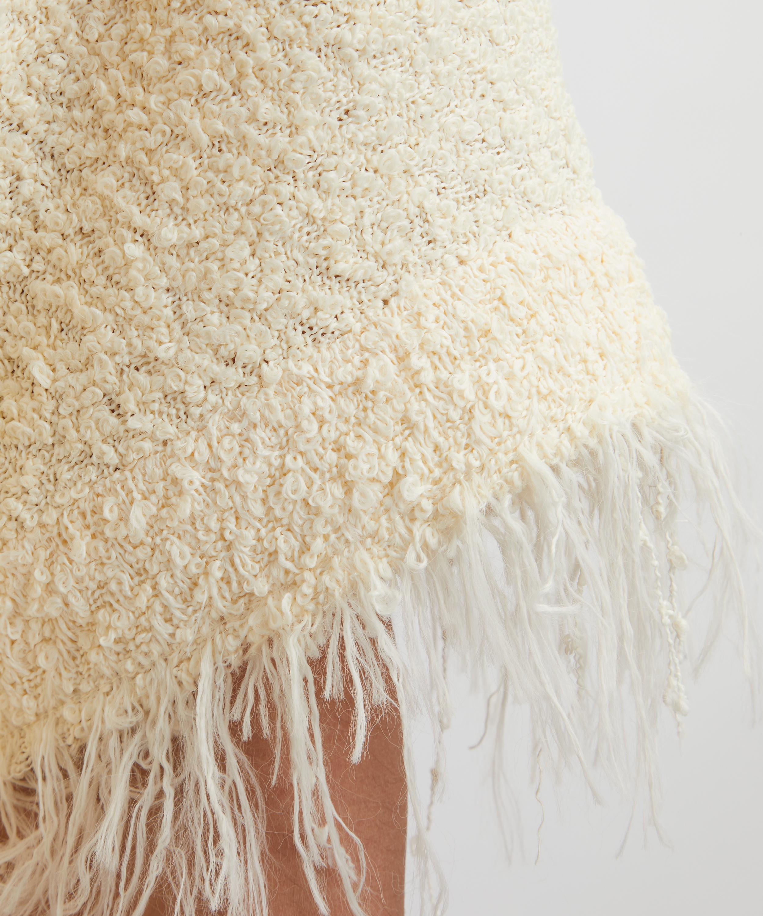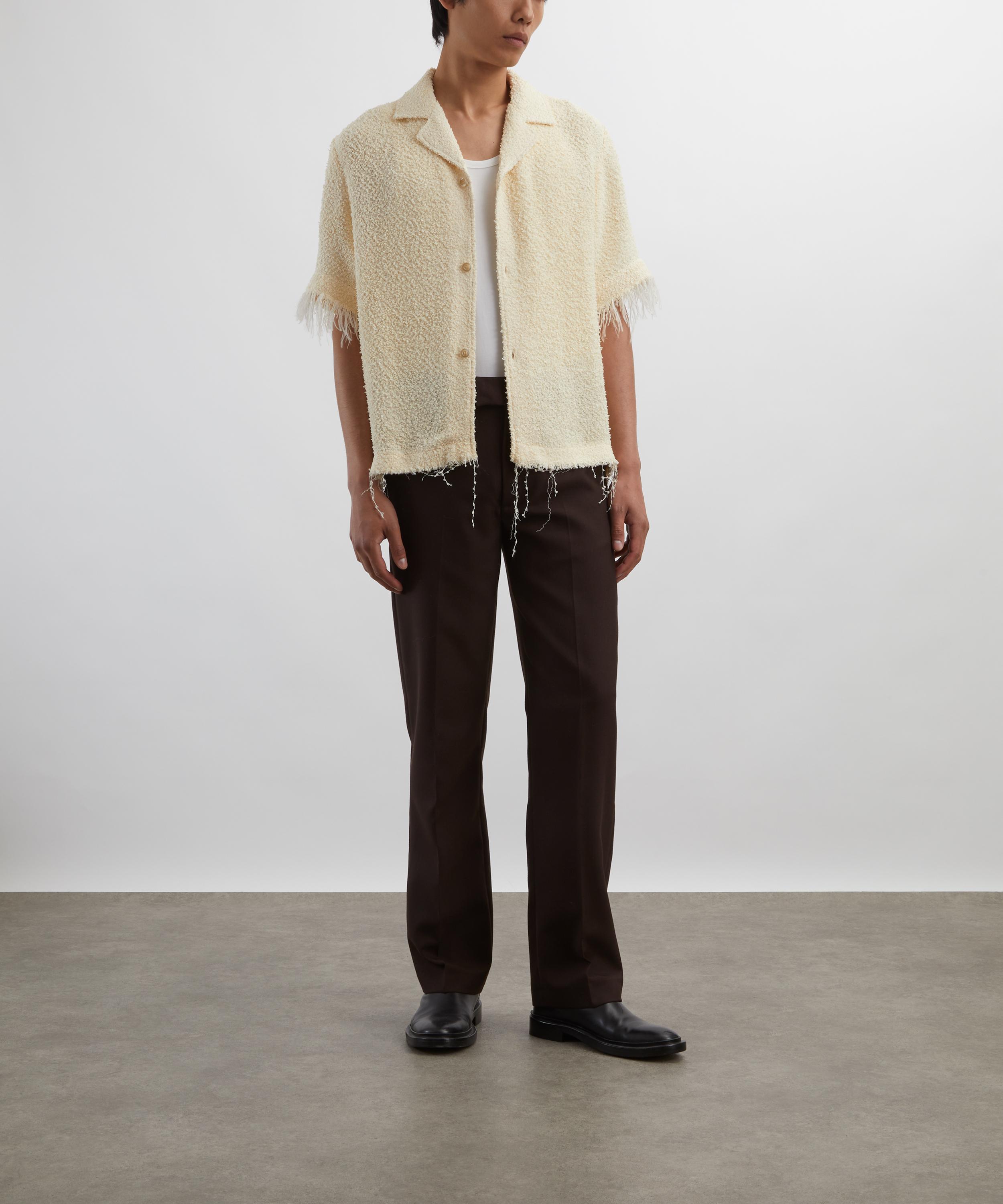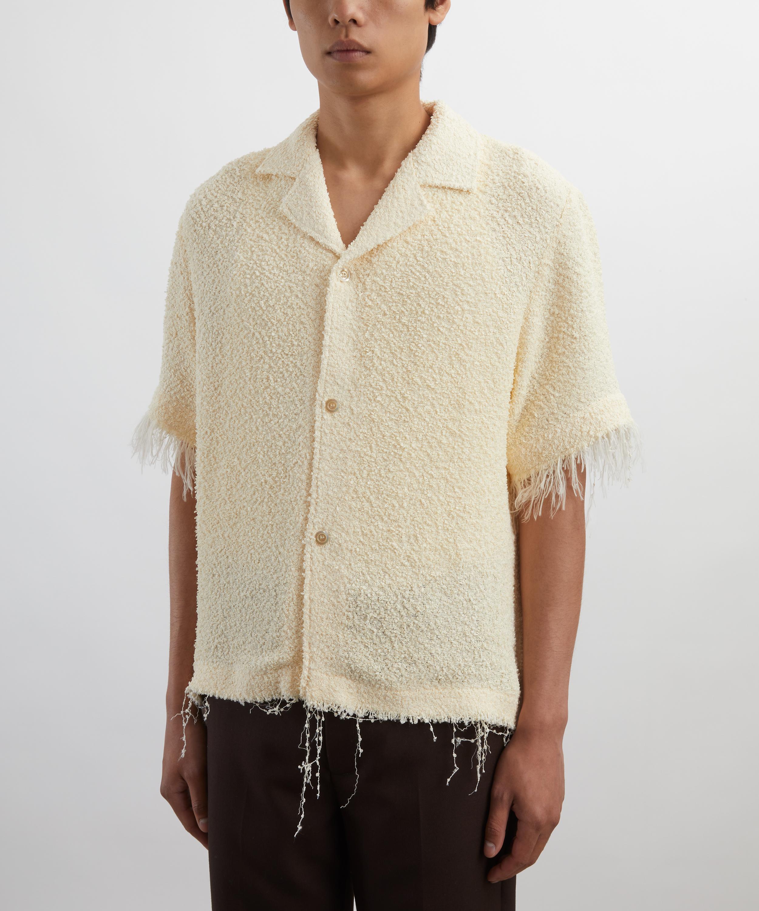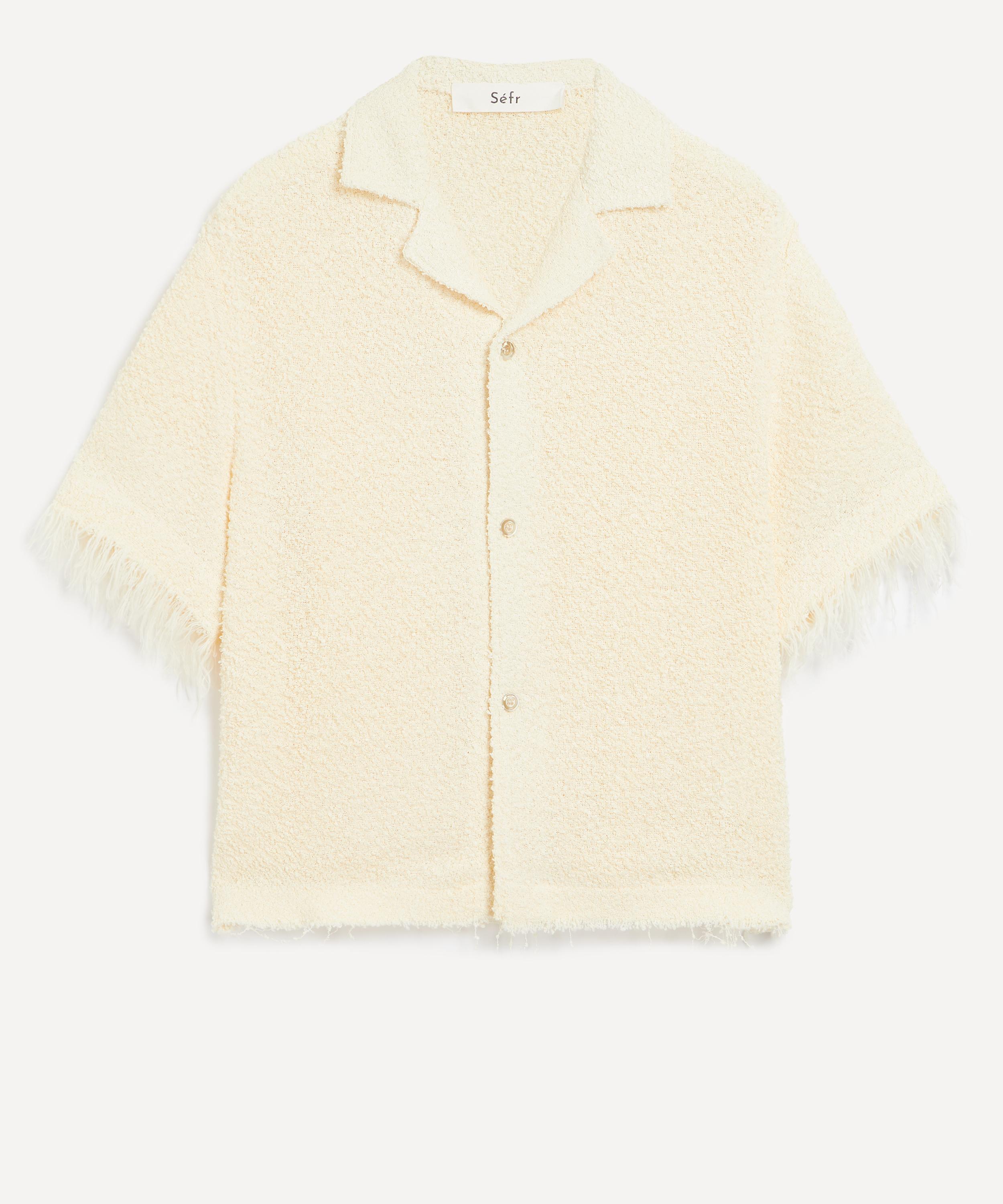 Crafted from super-soft cotton bouclé yarn, the Fausto has a camp collar, mother-of-pearl button closure, and distressed detailing on the cuffs and hem.