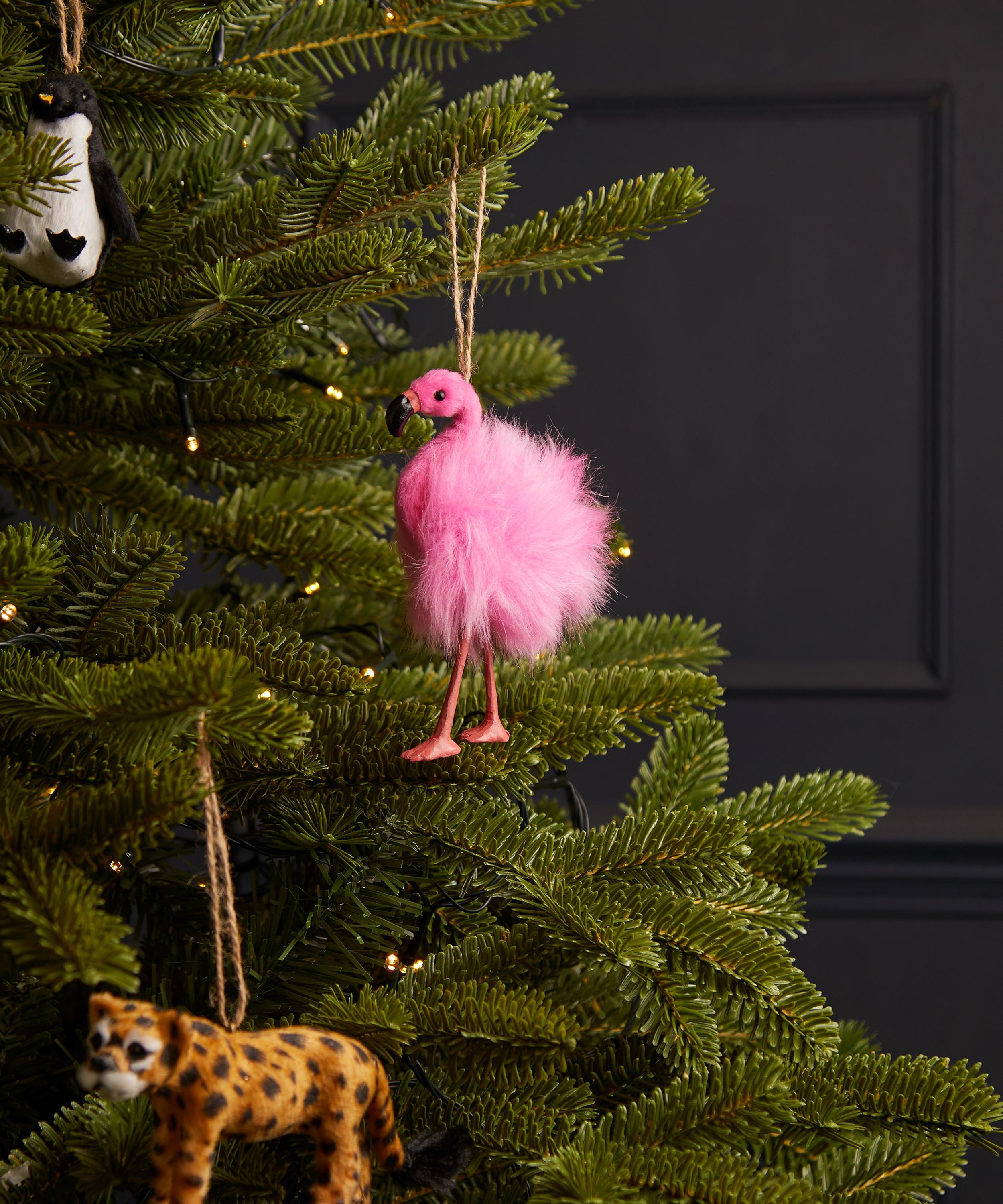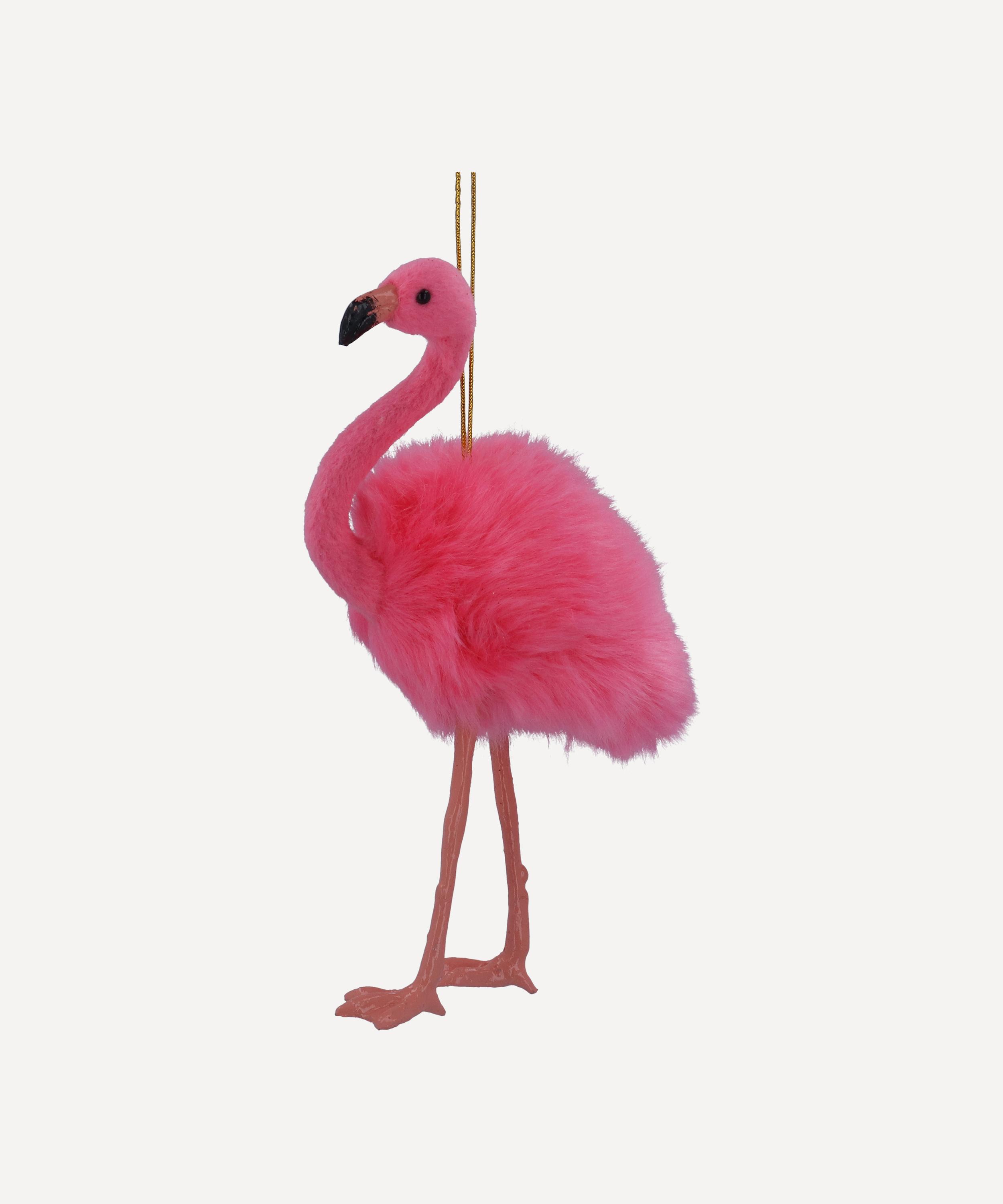 Add a unique decoration to this year’s pine with the faux fur flamingo ornament.