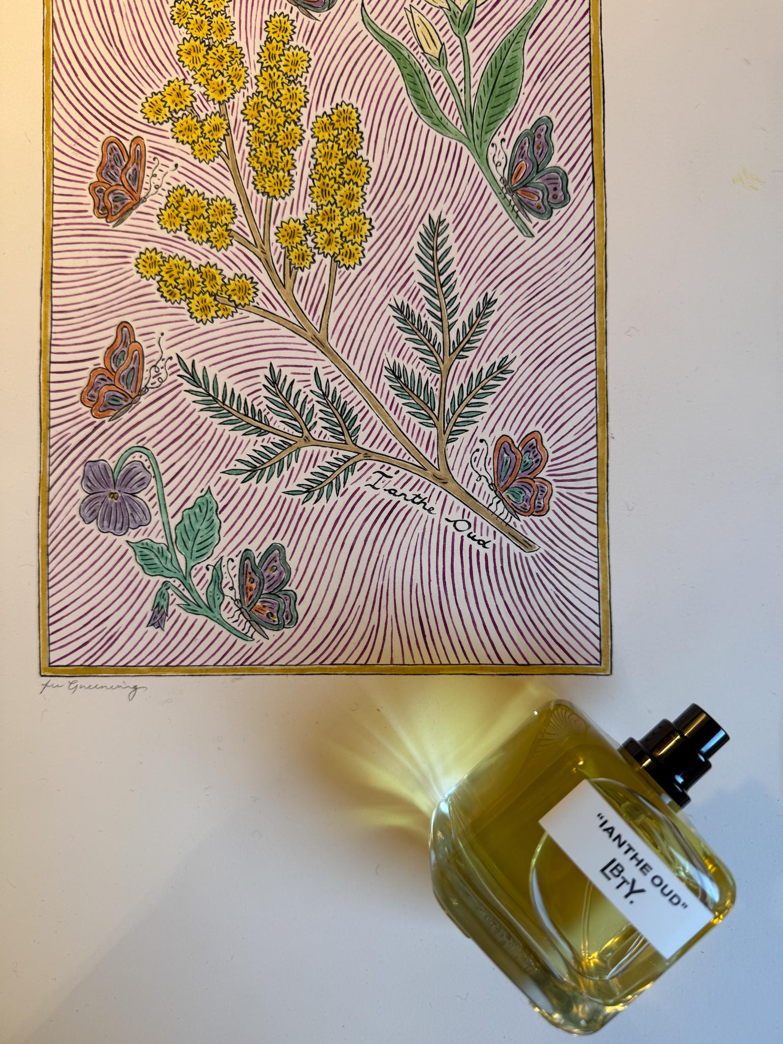 The dip pen and ink illustrator turns her ethereal eye to Liberty LBTY. Fragrance’s enticing oud.