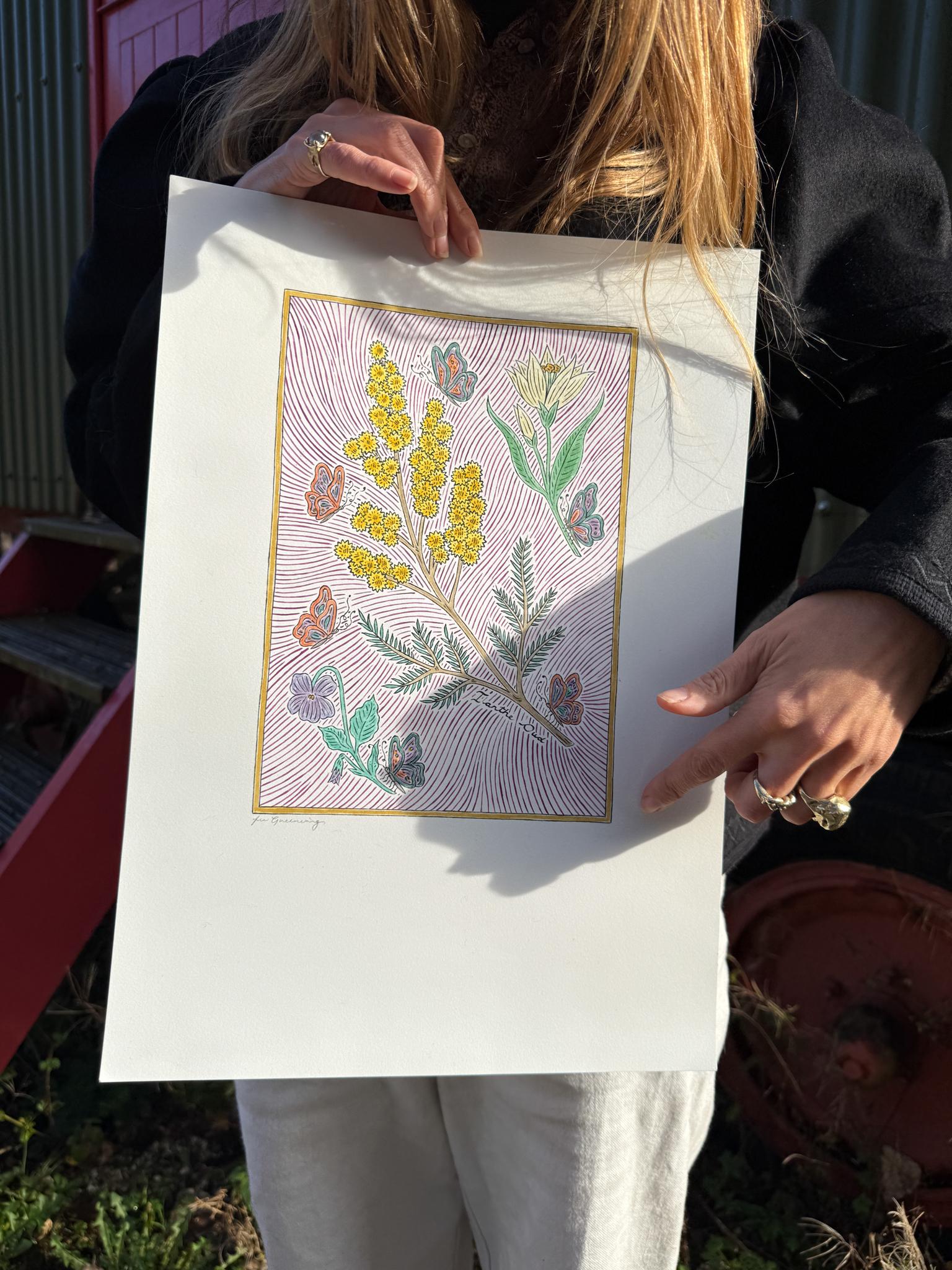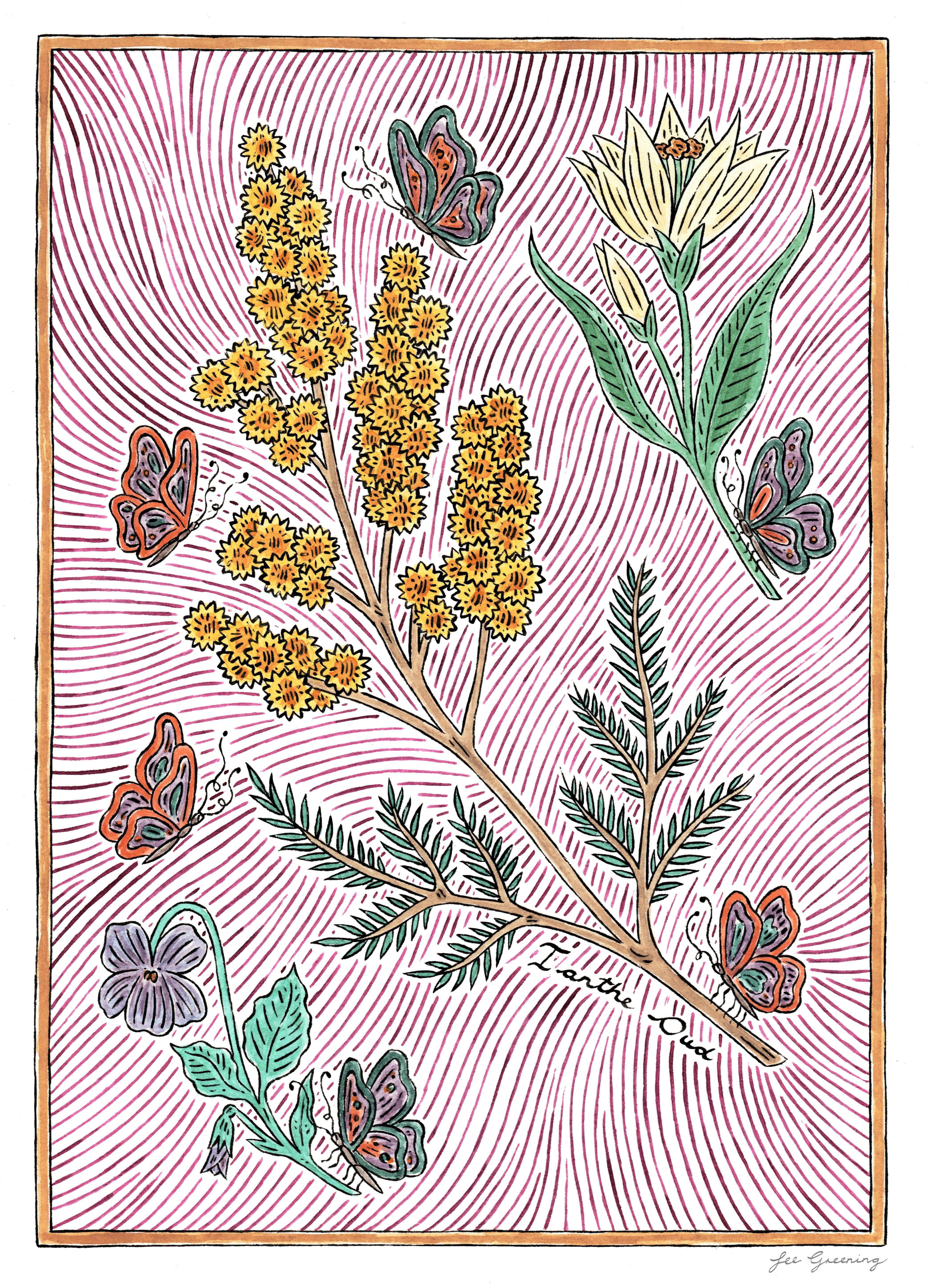 I wanted the florals in the scent to be the focus. There’s the pale bergamot flower at the top, the bright yellow mimosa, and the dainty woodland violet. The Art Deco curves from the packaging reminded me of butterfly wings, so I included butterflies with those shapes.