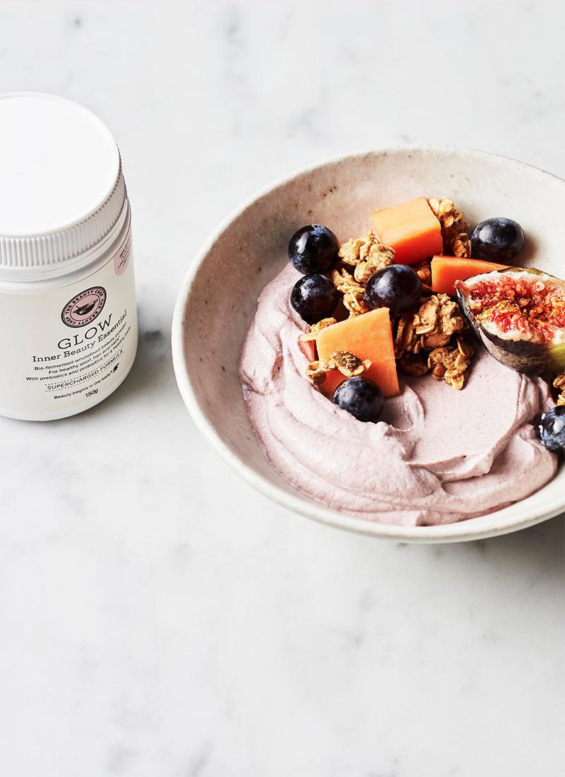“Containing skin-loving superfruits like Kakadu plum and maqui berry, GLOW Inner Beauty Essential is the ultimate nutrient-rich addition to your morning meal. Swirled through a creamy coconut yoghurt base—a good source of healthy fats—our bio-fermented beauty powder creates a vibrant breakfast bowl that truly nourishes from the inside, out.”