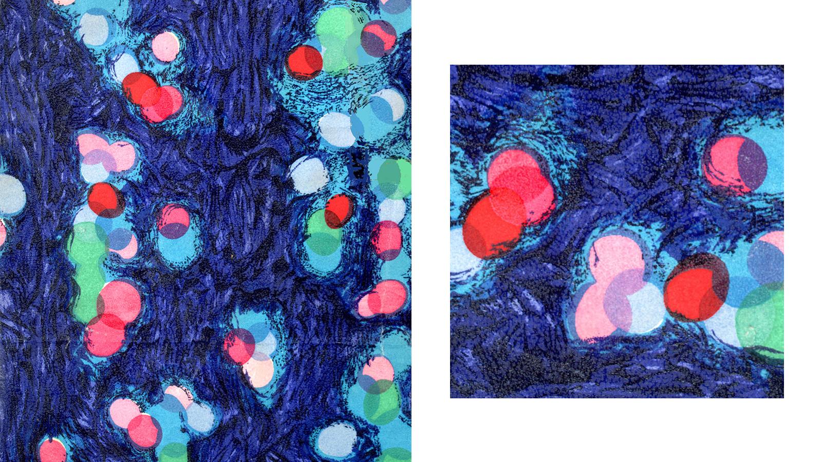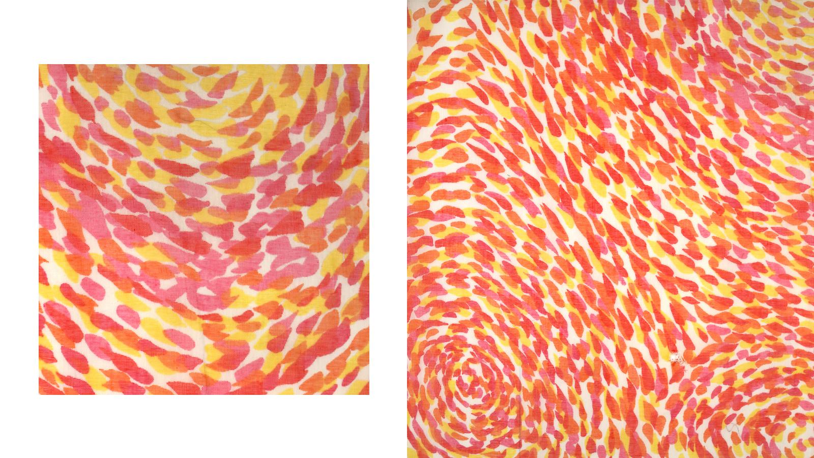 Created in 1959 and originally printed on cotton poplin, Cascade is an abstract geometric design featuring loosely painted trails of spots. These appear like neon pops of colour over a highly textured background.