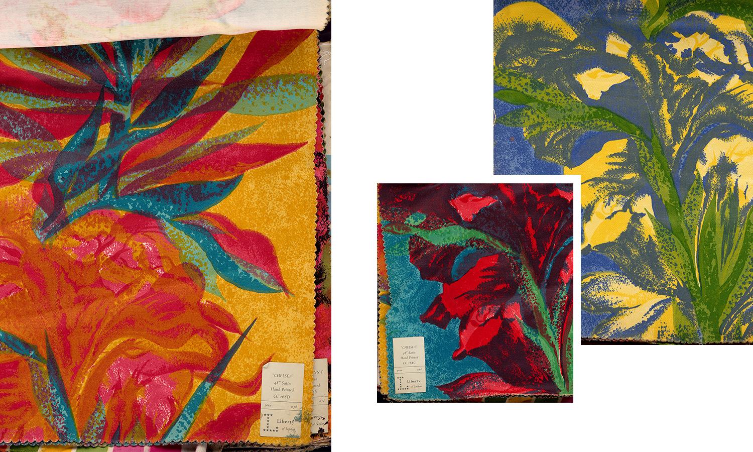 Chelsea is an abstract representation of flower bouquets created with an almost sponged effect, presented in an array of contrasting colour combinations. Created in 1958, it was printed on cotton satin as a furnishing fabric – appearing here in three different colourways, as found in an archival ‘60s Liberty furnishing book.
