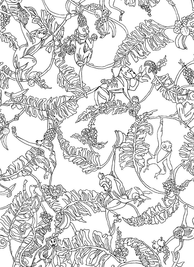 Tree Tops is a novelty conversational print, hand-drawn in pen in the Liberty Fabrics studio for the seasonal Autumn/Winter 2018 collection. It depicts a troupe of naughty monkeys swooping between palm trees, snatching bananas and watermelons from one another.