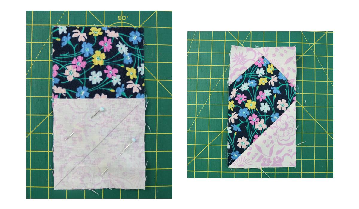 Mark a diagonal line on the wrong side of the four small and two large squares. Place a 2½” square at the bottom of a rectangle, with right sides together.