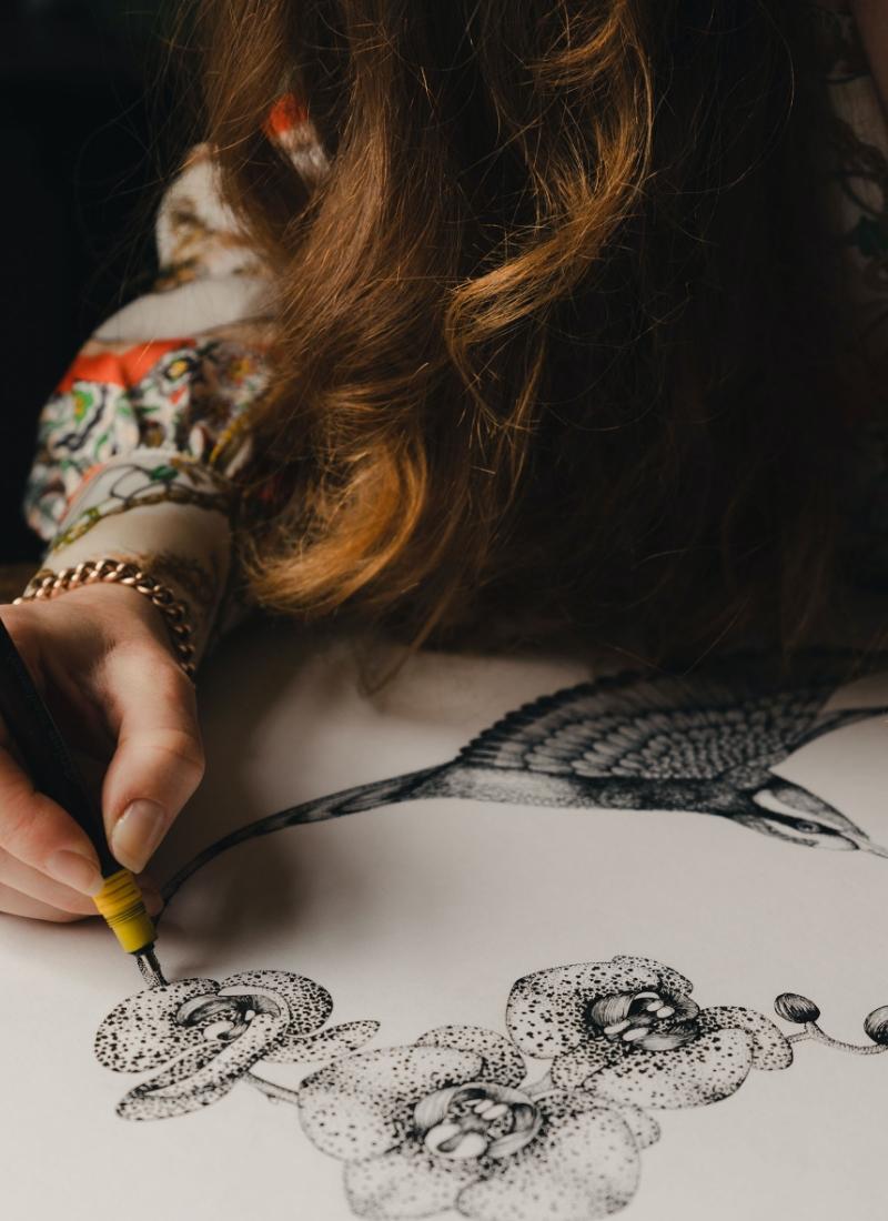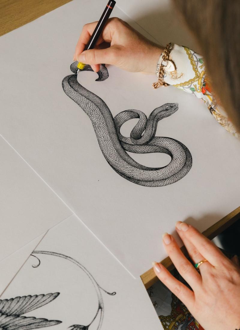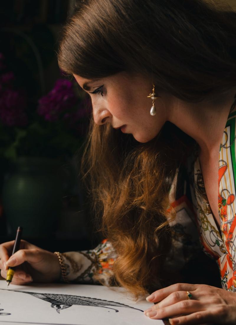 “I spent my childhood in the garden, exploring and identifying plants and insects, collecting specimens in jam jars,” says Emily Carter. “I would then return to the house with my findings and start my drawings.” For the textile and accessories designer, home has always been at the centre of her naturalistic and artistic explorations, and it’s a constant that has stayed with her since her early years. “It’s the beauty of the natural world that really appeals to me,” she explains. “This combined with the creativity aspect.”