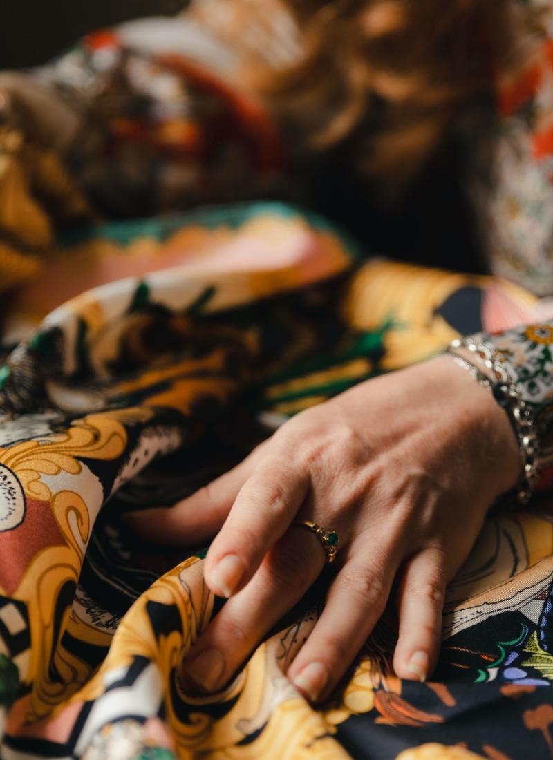 And yet, even in more urban surroundings she finds herself close to nature. “I have an idyllic little Victorian flat in Hammersmith,” she says. “Living by the water reminds me of being in the countryside, it’s the kind of natural beauty you’d never expect to find in London.” Inside and out, hers is a slice of London that delivers crucial stimuli to fuel her designs: “I have around six plants in each room – it’s more like a home-slash-jungle, so this feeds into my design inspiration. I’ve acquired an enormous collection of framed insects, particularly butterflies, as well as antique scientific illustration prints by Emile-Allain Séguy and Ernst Haeckel, which I’ve mounted together, along with a few of my framed scarves – it’s definitely the most beautiful wall in my home.”
