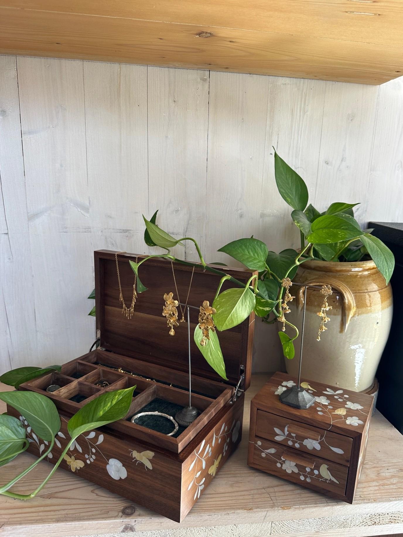Based in a higgledy-piggledy menagerie of a studio, adorned with an elegant selection of trinkets and foliage, every piece of jewellery is hand crafted in London, something Monroe describes as an act of human-to-human generosity. In the studio space, a small team precisely carves away at all manner of enchanting miniatures, from ferns and florals to elephants and the brand’s signature bees. An entire wall of hammers is positioned by the window, (with Monroe enthusing about the merits of each), and thank you letters from delighted customers are dotted around the walls.