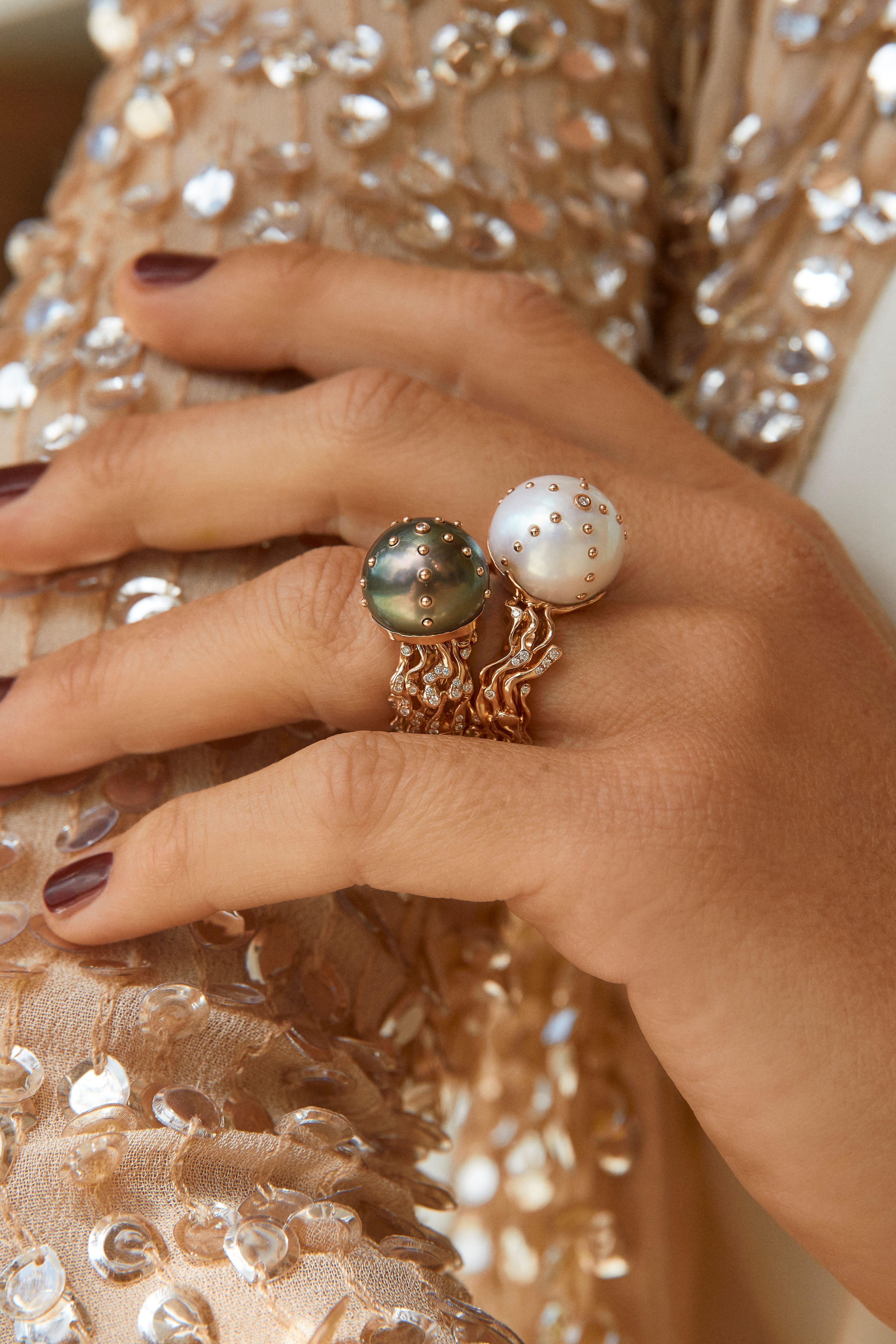 "Nature’s fluidity and grace are constant inspirations for me. This Jellyfish Ring is my homage to the mesmerizing elegance of these marine creatures. Pearls form the jellyfish’s ethereal head, delicate gold tentacles float around the finger, and diamonds mimic droplets of water catching the light. Wearing this ring feels like carrying a tiny ocean creature gracefully dancing on your hand."