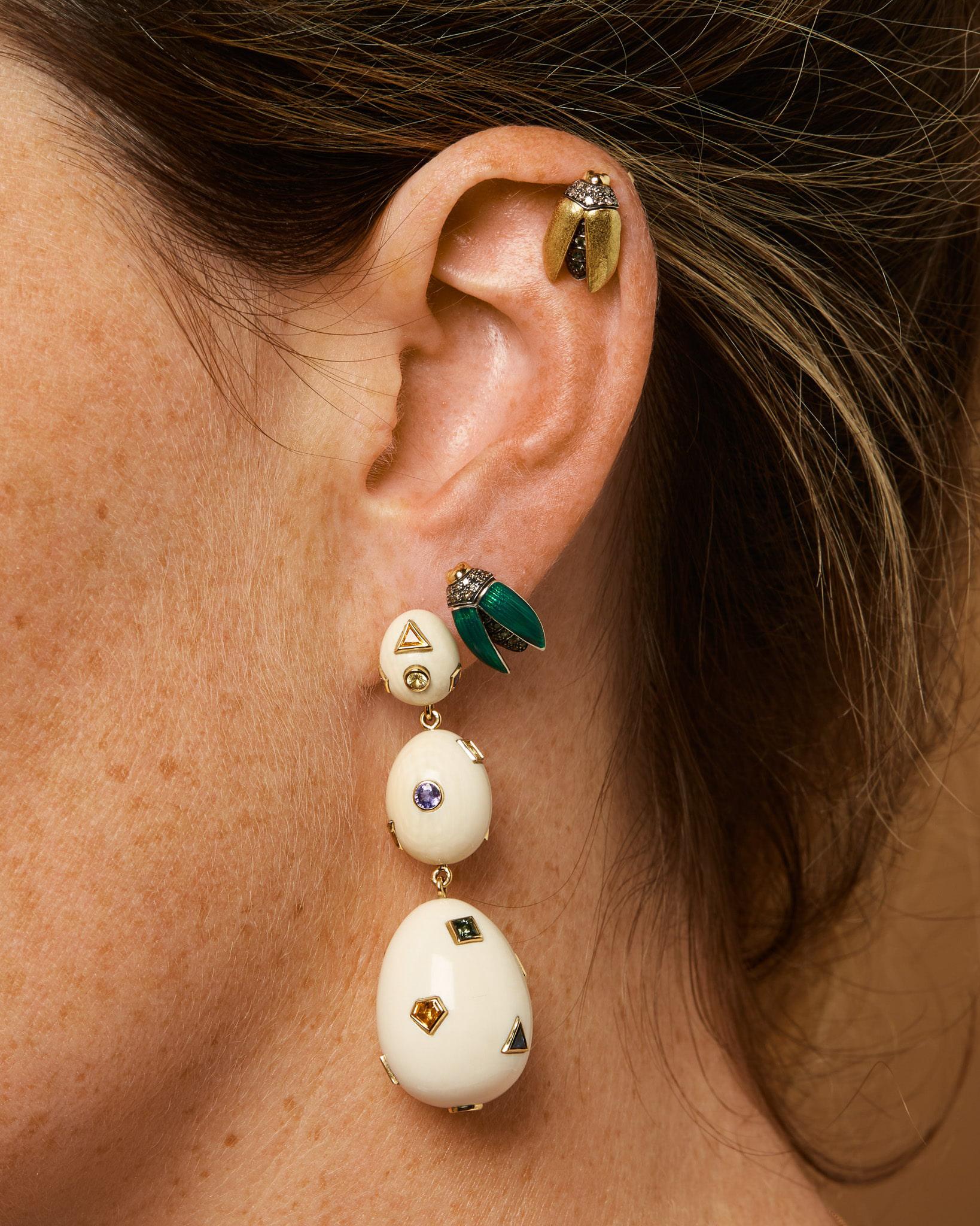 "This mini scarab stud is my travel companion, always ready to take flight. It’s a star player in what I lovingly call my 'ear party.' I delight in constantly shifting combinations, building up different stories on my ears to match my mood. The green enamel adds a playful pop of colour, reminding me to remain curious, adventurous, and ever-changing."
