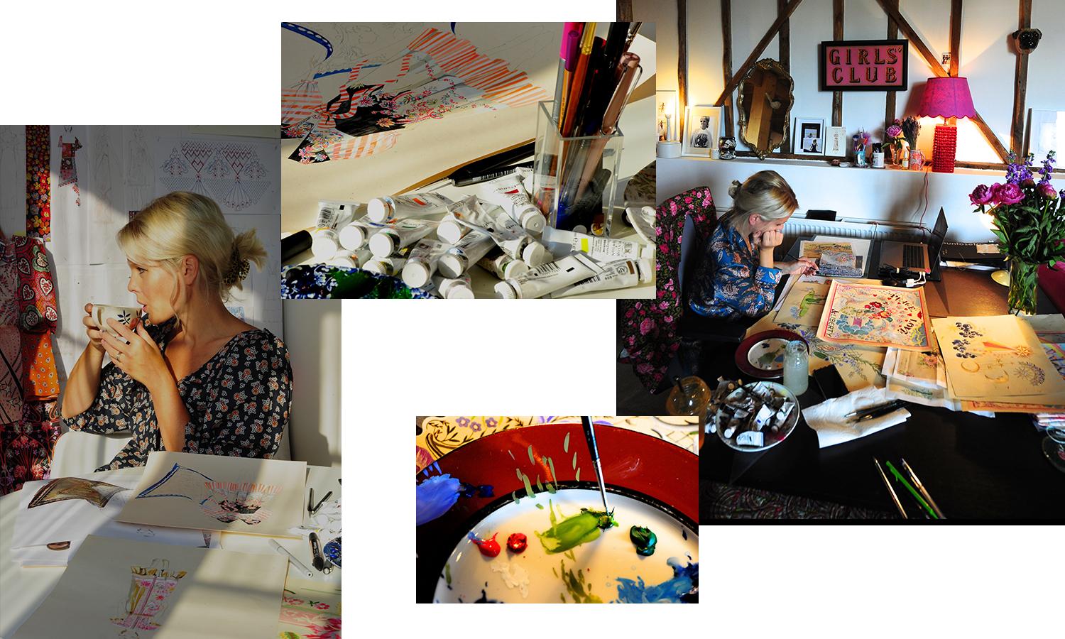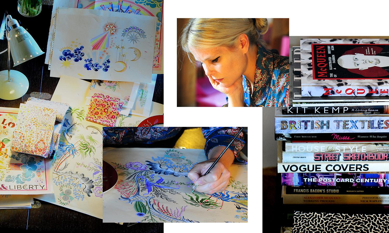 Marler works in a whirlwind of creative references. “Stories and story-telling inspire me just as much as beautiful images do,” she explains. “I like all my drawings to be informed by a story or a moment in time.” When gleaning inspiration for future collections, Marler likes to visit the National Art Library at the Victoria & Albert Museum in London’s Knightsbridge: “It is steeped in heritage and the room looks completely magical, like it is waiting for you to discover something. It is full of people and very busy, yet really quiet and dark, lit with Anglepoise lamps. It’s so different to my normal surroundings, and it really gives you space to think.”