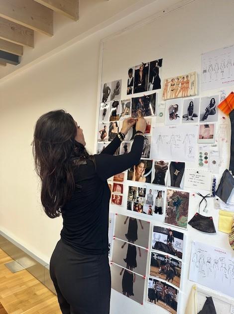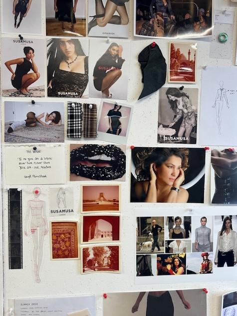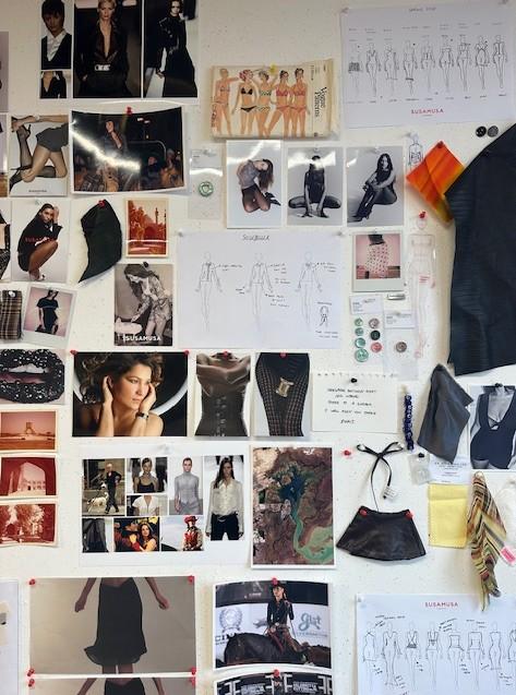 Moodboards propped against the wall feature inspirations ranging from nineties catwalk shots, to verses of poetry, to swatches, sketches and even a glamorous portrait of Asal’s mother who, alongside a small team, helps bring the Susmusa vision to life. Alongside the retro references and vintage Vogues, an ornate Persian rug lies on the floor, underneath a wooden table which, Asal tells us, has been a constant for the brand since it all began.