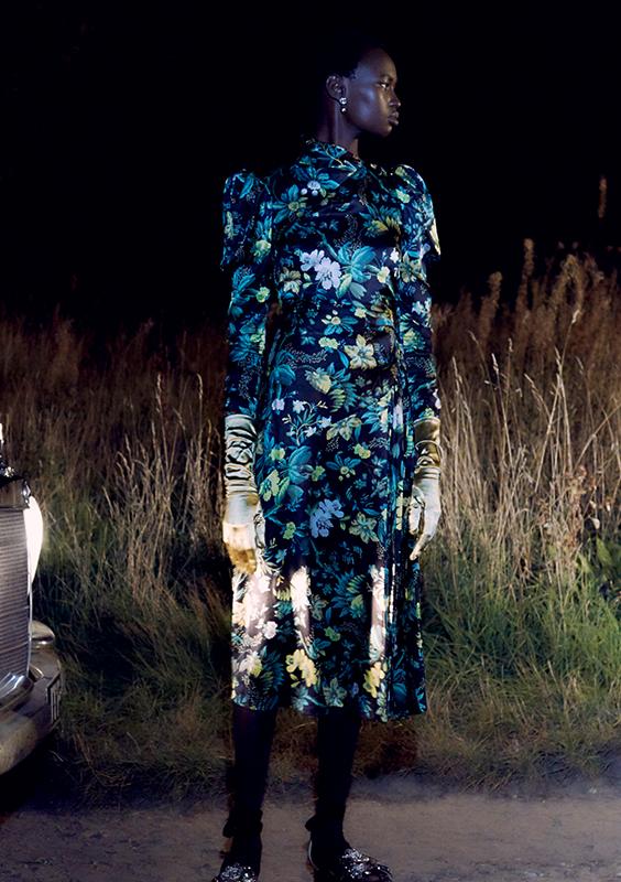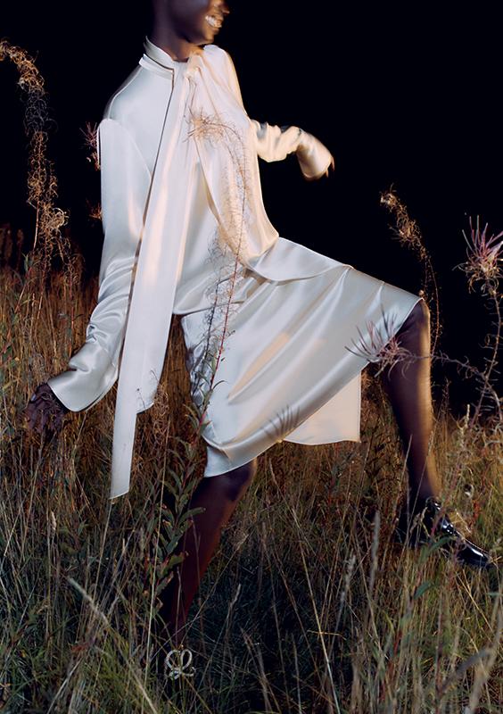 “Play the decadent minimalist in Loewe’s Lavalliere gown. Draped satin construction and a pussy-bow neckline show Creative Director JW Anderson’s ability to riff on well-mannered, classic silhouettes at its peak.”