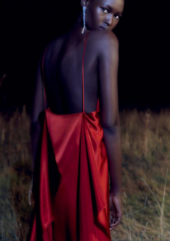 “Bernadette makes another winning case for nightwear-as-eveningwear with this crimson slip dress. No matter the time of year, no one can resist a low back - especially set off by Simon Rocha’s dripping, icicle-like earrings.”