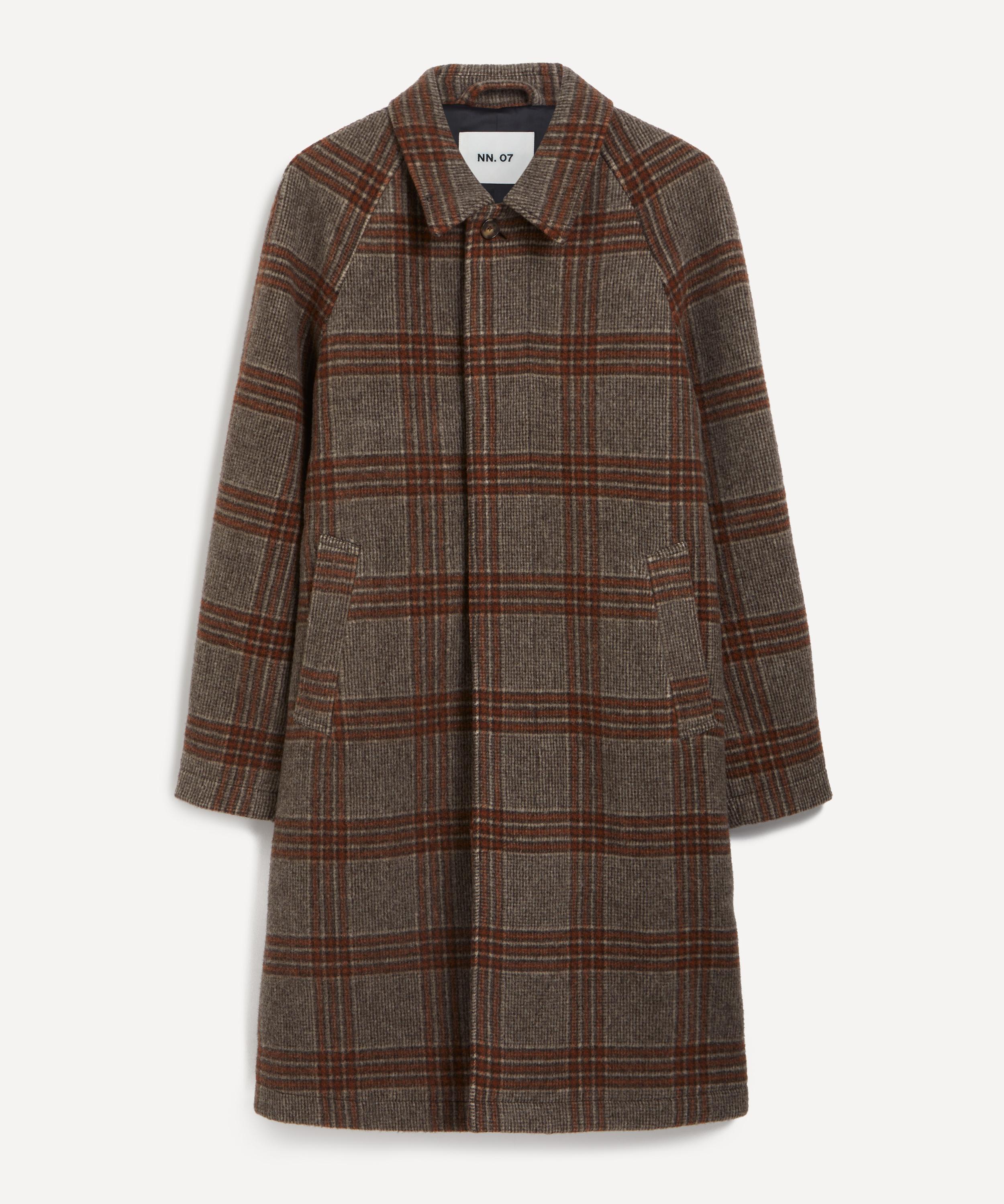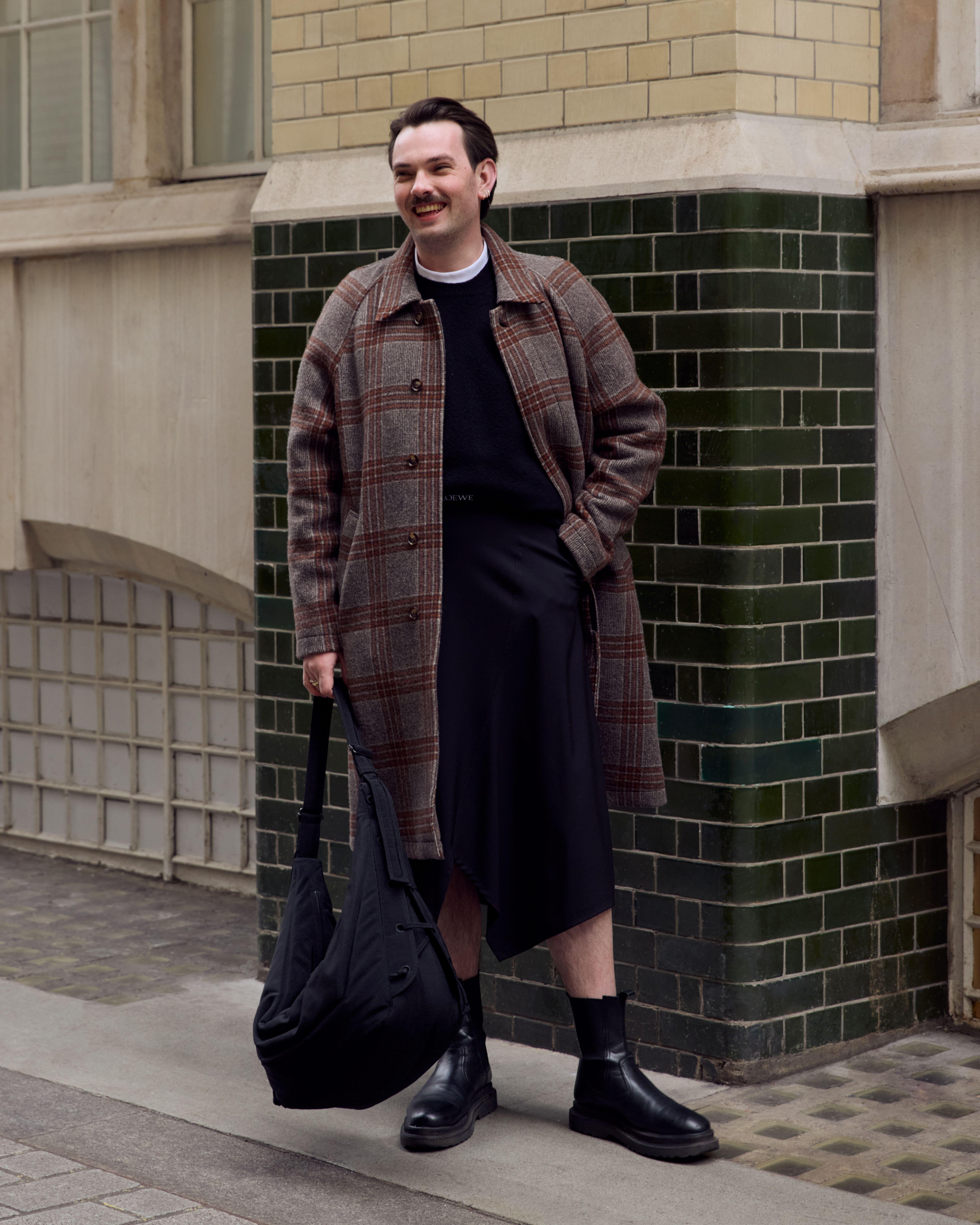 “I love to blend pieces from our men's and women's departments, so the strong lines of the boiled wool Róhe jumper and oversized NN.07 trench coat with the asymmetrical LOEWE skirt is perfect.”