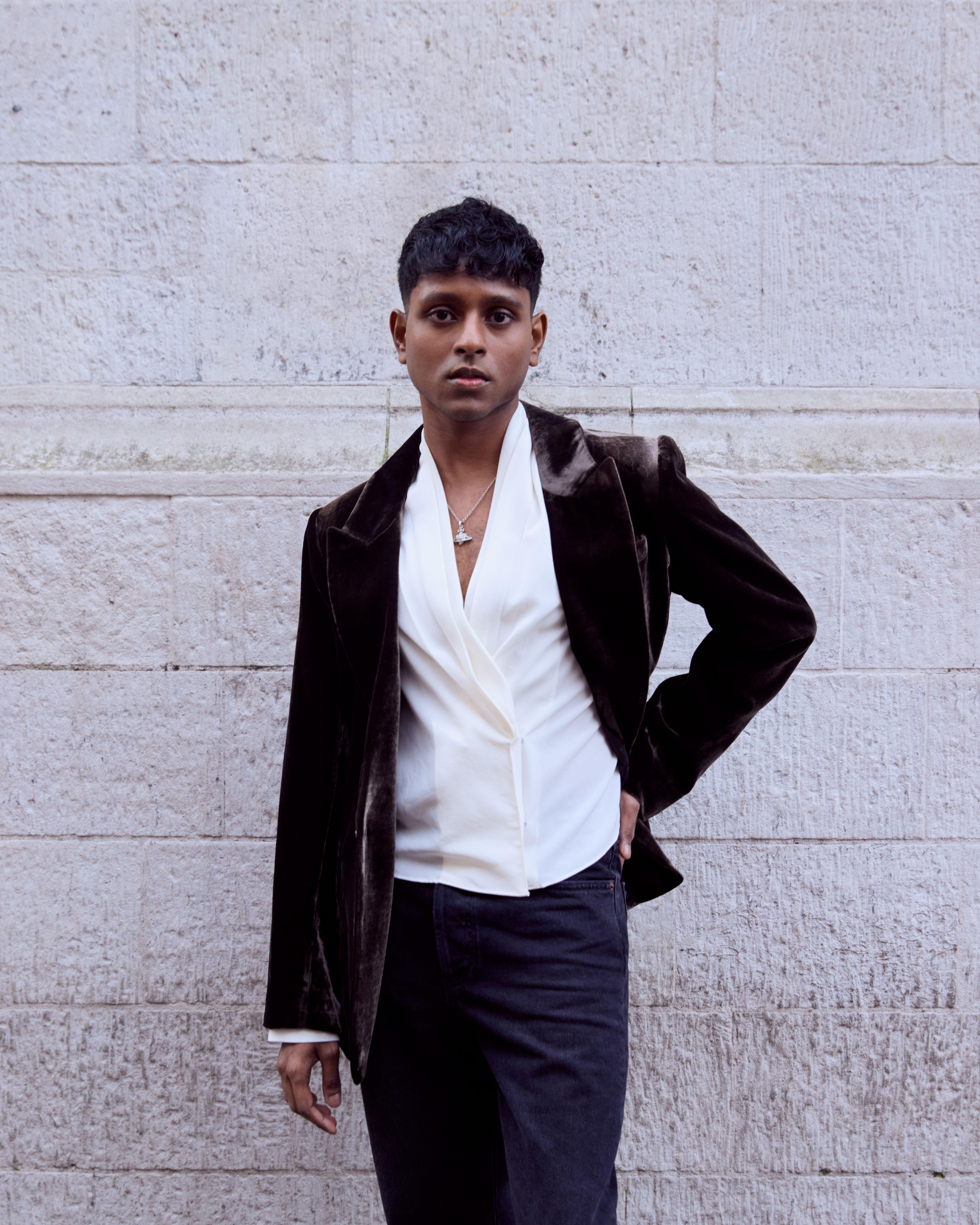 “I chose this look for its perfect blend of elegance and modern edge, ideal for a date night for Valentine’s Day. The AGOLDE jeans bring a relaxed yet polished vibe, while the FRAME Velvet blazer adds a touch of sophistication. The FRAME Shawl Collar Silk Shirt keeps it timeless and chic, serving as the perfect backdrop for the statement Vivienne Westwood necklace, which adds a bold, romantic flair. This outfit balances effortless style with thoughtful details, making it perfect for date-night-ready this Valentine’s Day."