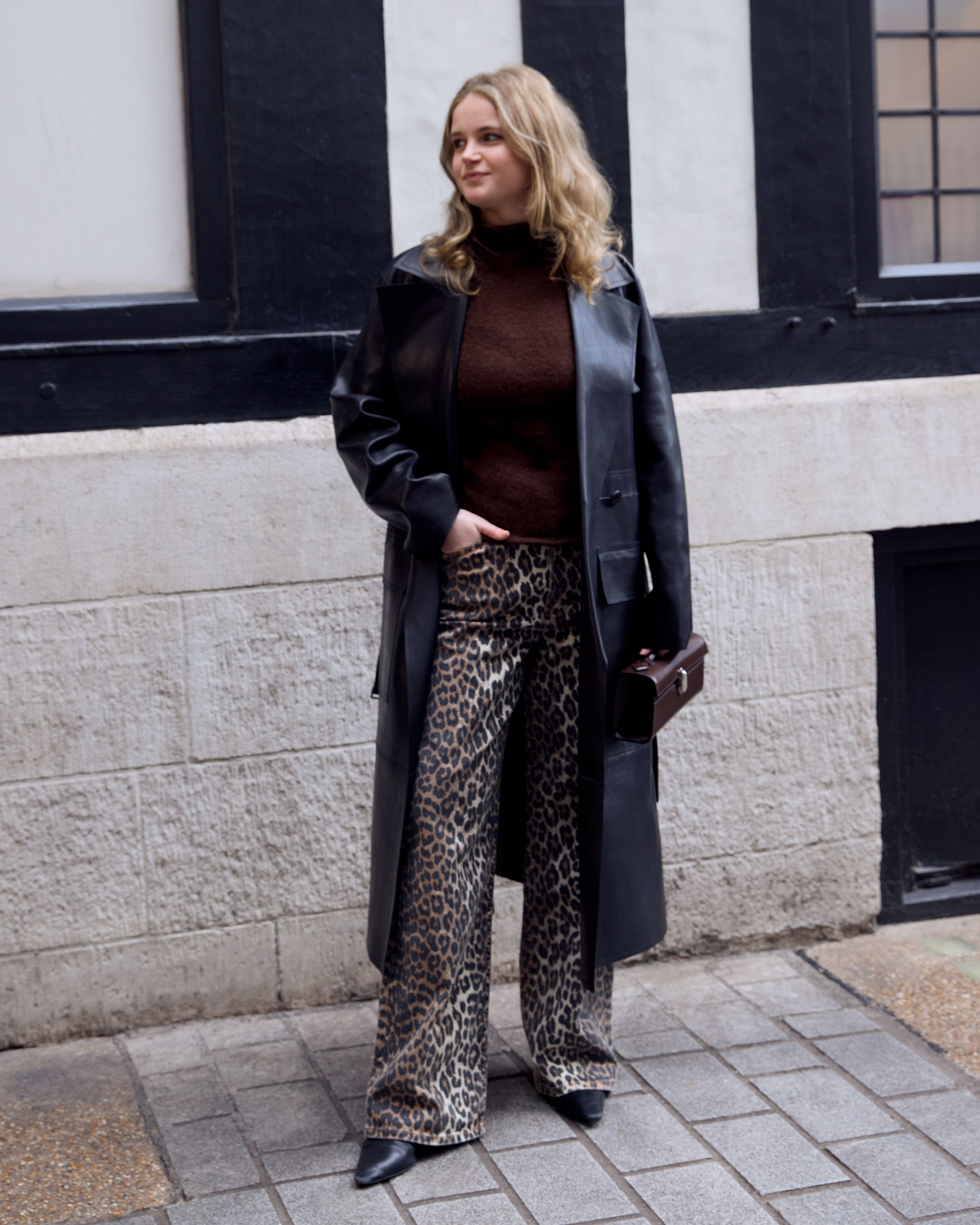 “I chose this look because it blends timeless elegance with bold playful elements; a luxurious leather coat from Joseph worn with statement trousers from Ganni, complimented by a rich chocolate turtleneck from Paloma Wool and the star of the show, a brown bag from Savette."