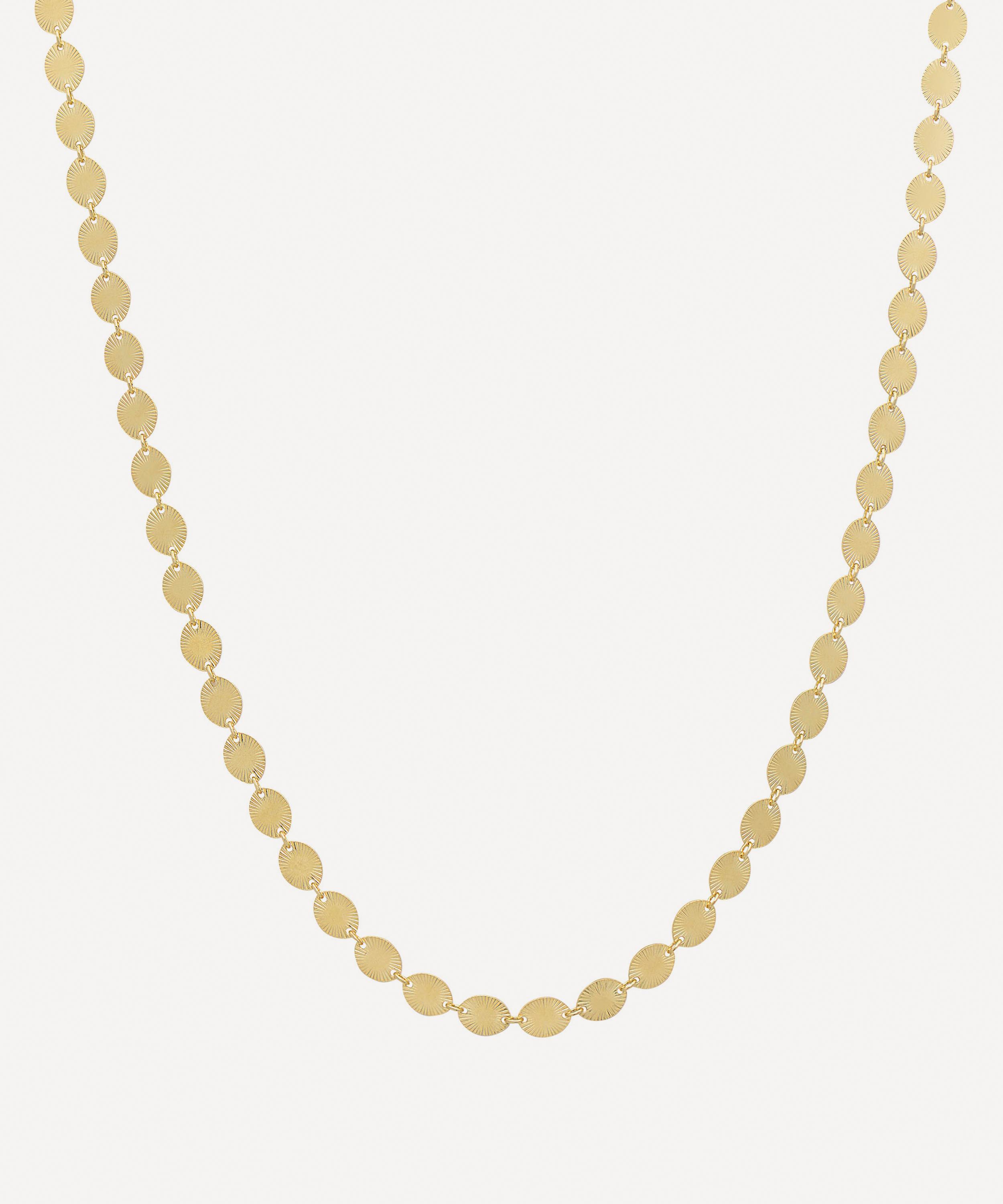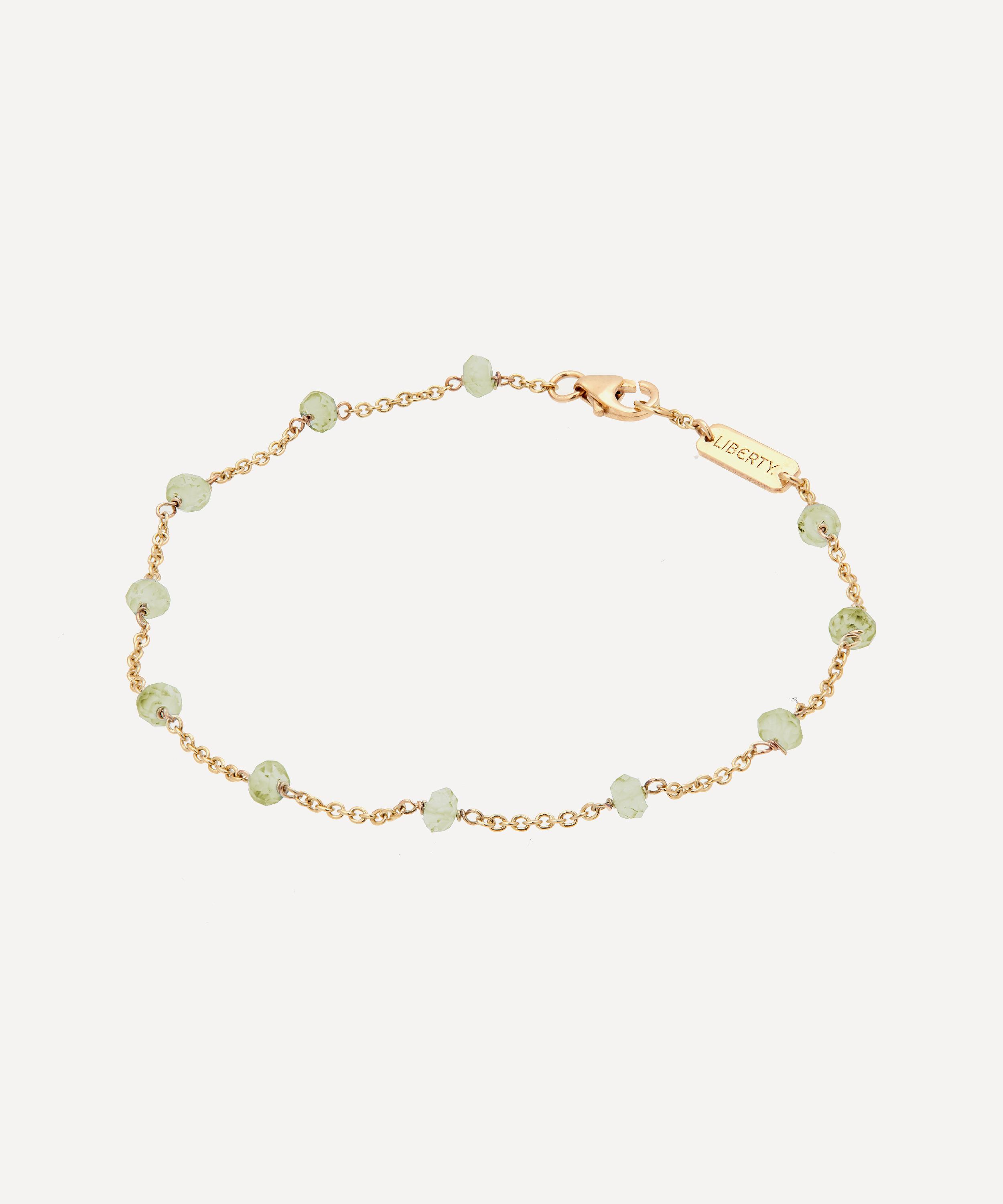 With a highly patterned dress, I would opt for low key jewellery. The slightest glimmer from a chain nestling on your collar bone, or the tinkle of delicate semi-precious bracelets on your glowing skin, like Liberty's 9ct Gold Pepper Peridot Bracelet, £235 are just enough to make you subtly stand out. As for earrings, I like to think tonally and wear those like Grainne Morton's Gold-Plated Asymmetric Multi-Stone Three Charm Drop Earring, £315, the kind that'll tie into the colour scheme of the dress.