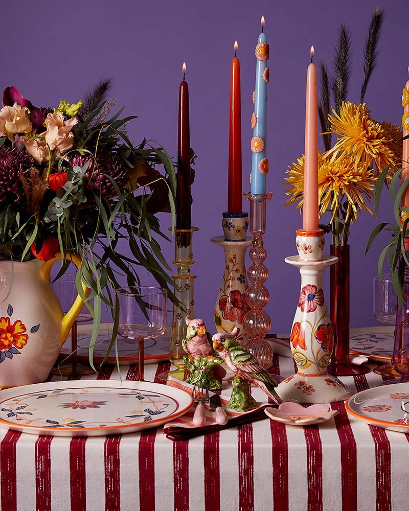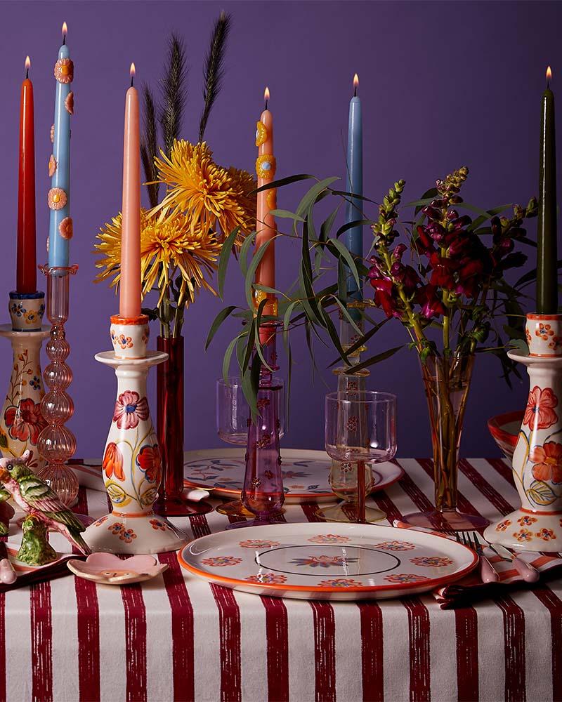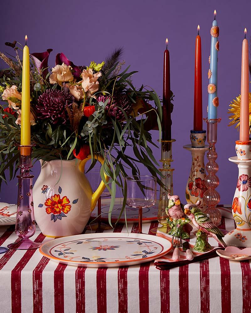 BRYONY | For me, more is more. The range encourages layering of ceramics, glass, textiles, alongside towers of fruit and flowers. The bud vases make for perfect pause moments on the table and a fun contrast against the stripes. The contrasting colours of burgundy and orange lend itself to a festive foray, adding some brass and gold.