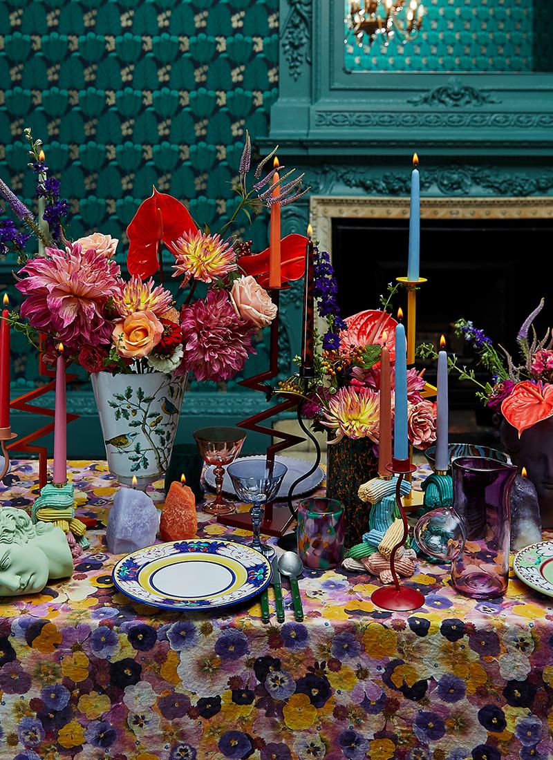 Gone are the days of ‘Sunday Best’. Show off your personal collections, be it heirloom crockery, an extensive set of Astier de Villatte, or a kaleidoscope of coloured glass. Find a palette that suits the mood and build from there – soothing greens and blues work for me, conjuring images of the sea. As evening draws in, the candles make it moody and twinkly. I love print play, so am never afraid of clashing prints. Flowers are a must; keep arrangements low to the table with a feature space on a mantlepiece. I place flowers and create my tablescape before guests arrive.