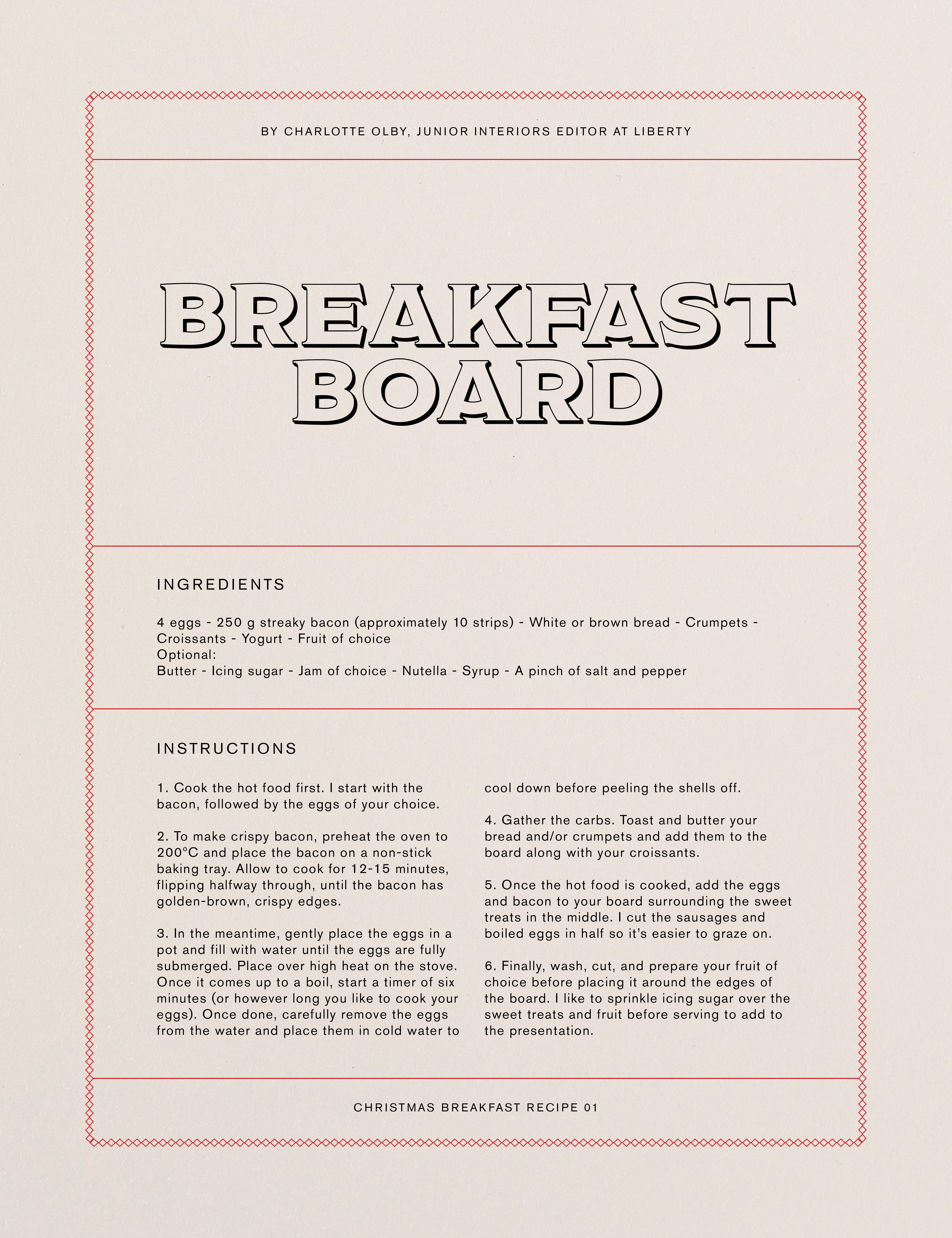 "There is nothing I love more than a charcuterie board around the holidays, which is why a breakfast board is a perfect option in our household – especially when there are plenty of mouths to be fed. Not only does this grazing board allow you to have the best of both worlds (savoury and sweet food all piled up in one place), but it’s super easy to put together and the mess is minimal. Plus, it goes down rather well with a Buck’s Fizz in hand."