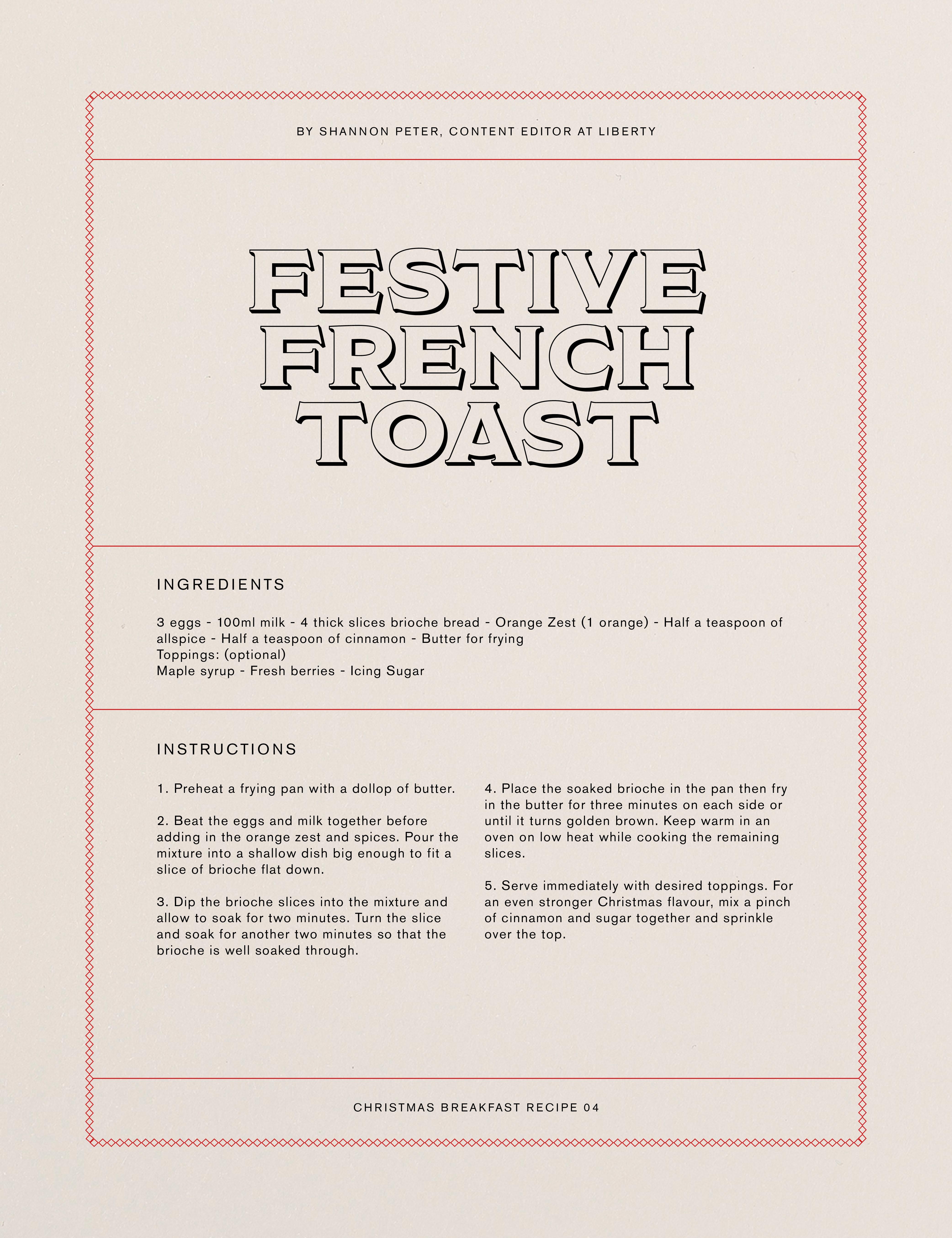 “French toast is, of course, simply a more elegant name for eggy bread, but the zest, toppings and spices make it all the more impressive than the standard-issue edition. If you tend to go for a big dinner on Christmas day rather than a traditional lunch, then this big, bold breakfast will keep you full right up til the main event.”