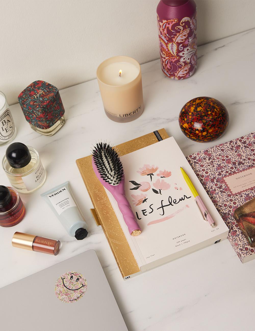 "My desk is normally surrounded by samples and deliveries so it rarely looks as tidy as I'd like, but I always keep a few key things to hand to use before jumping in to my next meeting. A rotation of a few of my favourite old and new fragrances, one of the mini La Bonne Brosse brushes (I love this rosy pink!), a lip gloss or lipstick – Lisa Eldridge is one of my new favourites, and a hand cream (much needed at this time of year to keep hands soft and hydrated). And of course, there has to be a candle. You can’t go wrong with Diptyque Baies but I also love Hera from the Liberty collection."