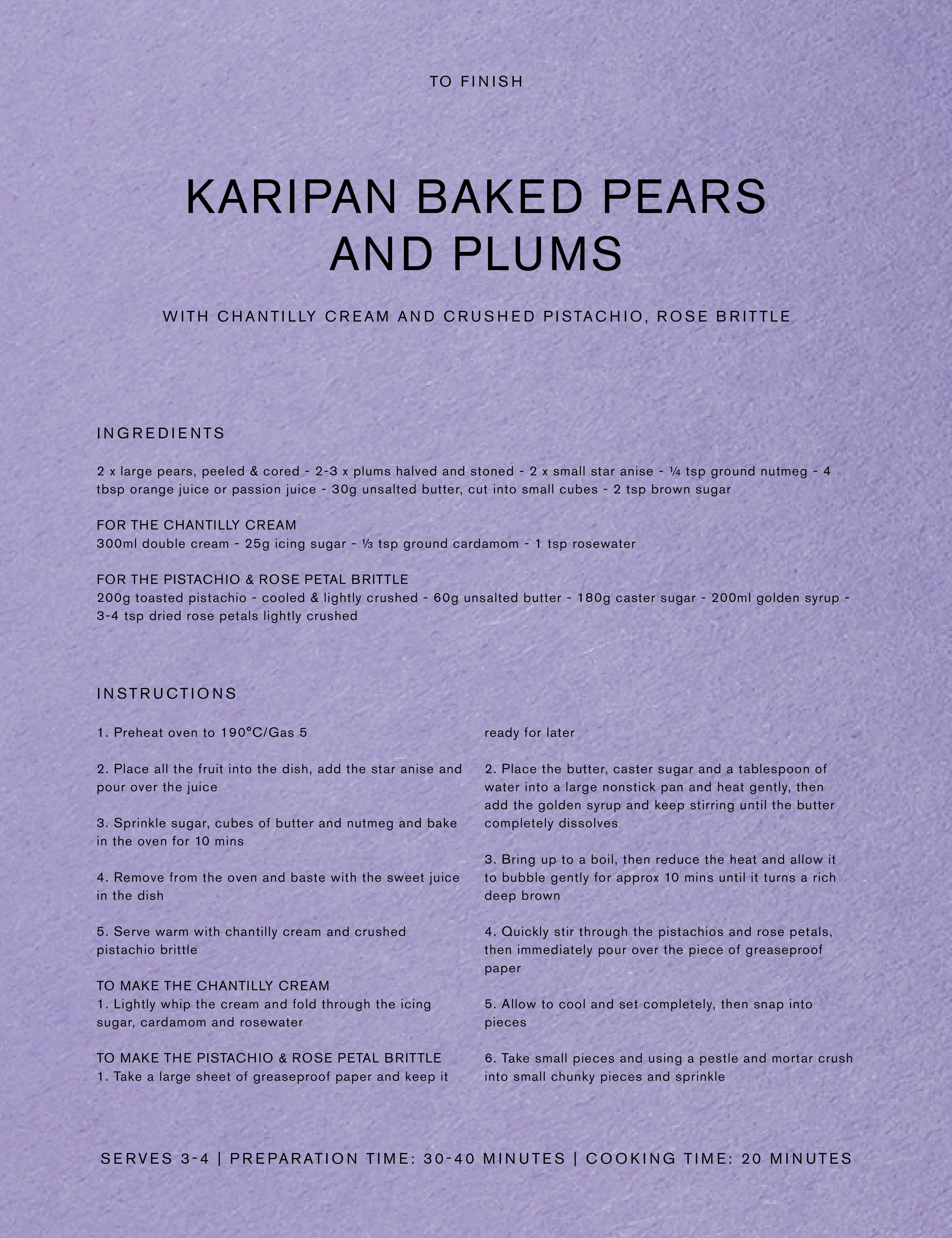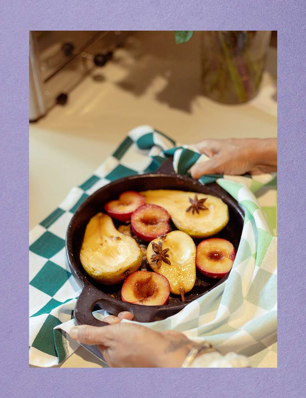 "I don't have much of a sweet tooth myself, but serving something sweet on Diwali is a must! My go-to is this super easy, eye-catching dessert of poached fruit and cream. It arrives on the table warm and sizzling from the oven. I always make fruit-based dessert dishes in our Karipan as it's the perfect size. The Chantilly cream that goes with it is always a hit."