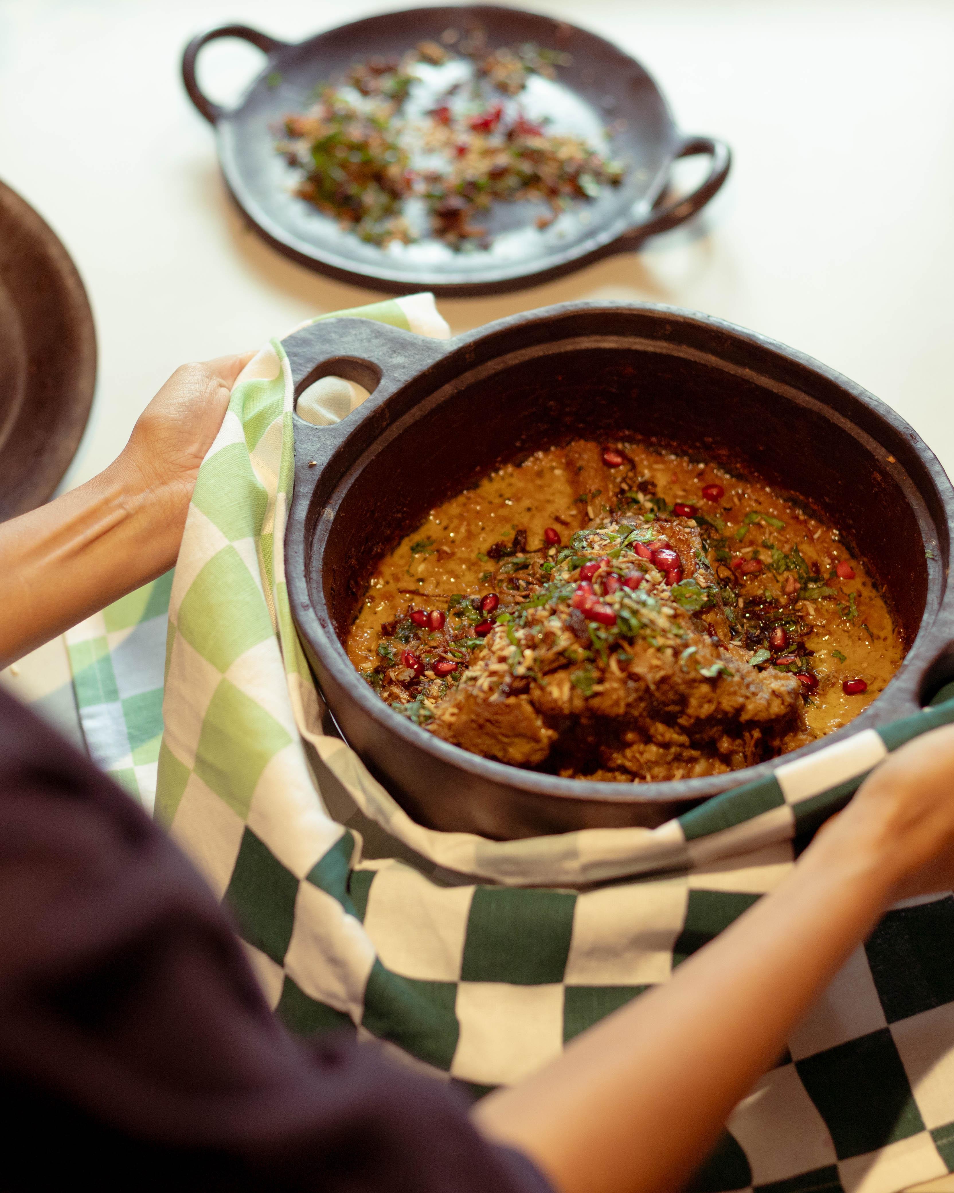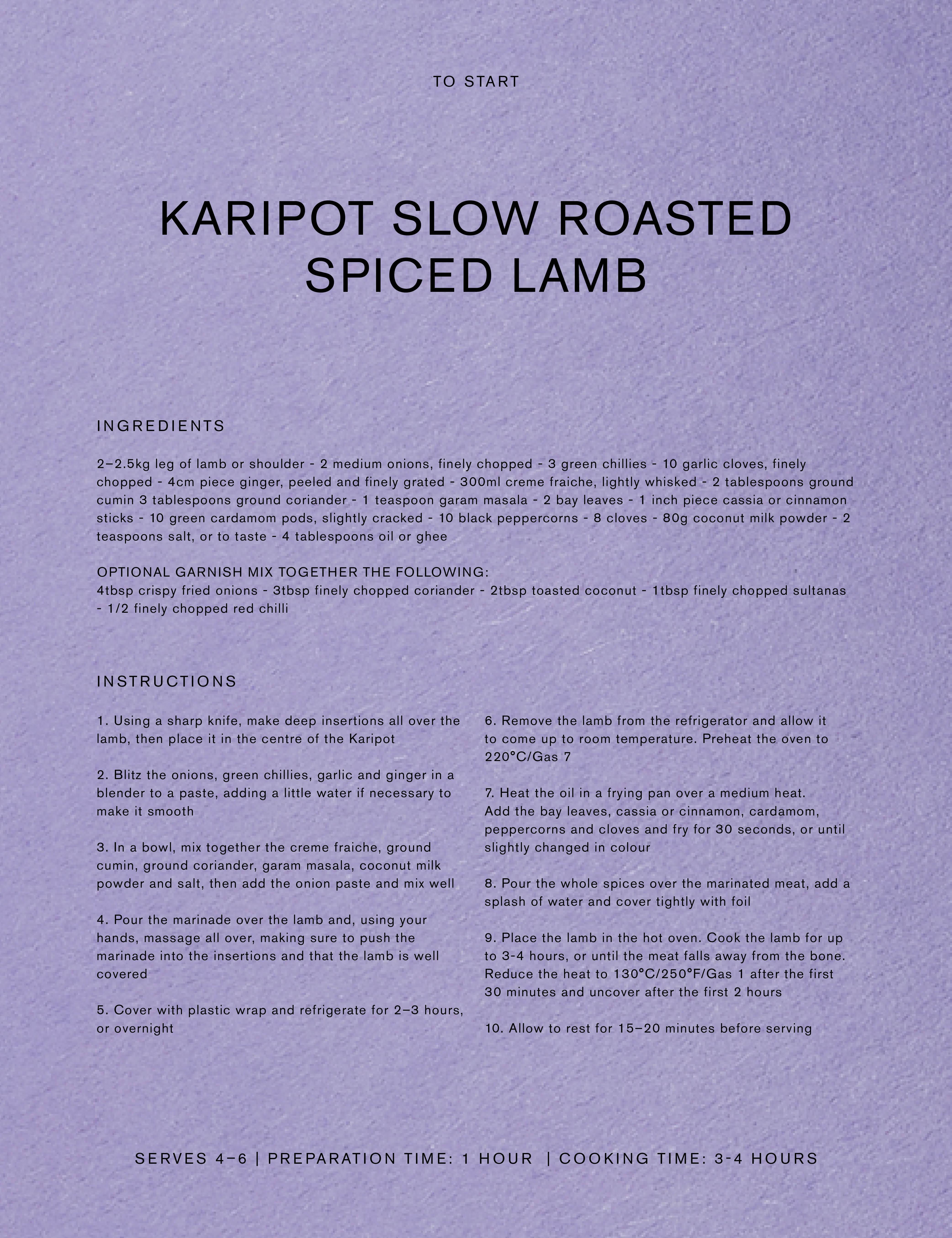 "I cook in my Karipot all the time. Call me biased, but everyone who has used this pot is amazed at its cooking properties. This Slow Roasted Spice Lamb Amandip has cooked for me before during Diwali, and she finds the Karipot the perfect dish to use. Not only is it ideal for slow cooking, but also has the properties of the ceramic and the design to fully circulate moisture in the way metal pans or Dutch ovens can't. This recipe is so easy to do! I do all the prep the night before, marinate, and just stick it in the oven while I carry on with the rest of my day. The garnish makes the dish look all the more festive when it arrives on your table!"