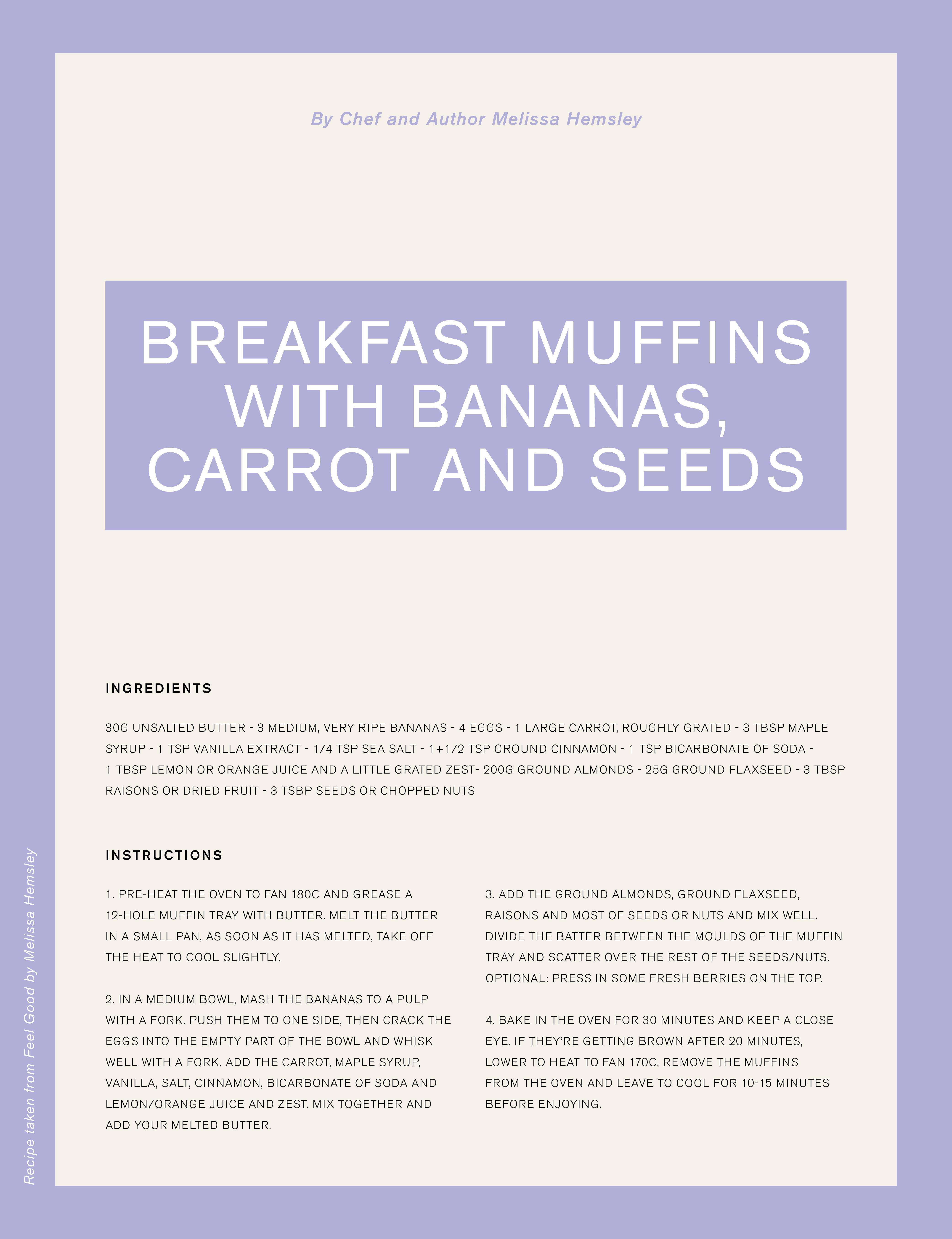 "‘Our kitchens are great places to connect with ourselves and with others; what we cook and eat can help to build the emotional scaffolding that supports our busy lives and sustain us through the toughest times. Food alone can’t solve all our problems, but it can play a part in uplifting us, offering nourishment, physically and mentally, and inspiring a little more joy at home. Very ripe soft bananas work best for these energising breakfast muffins, but if your bananas are just ripe and not soft, then you may need to add another tablespoon of maple syrup. These are breakfast muffins, so are just a touch sweet."