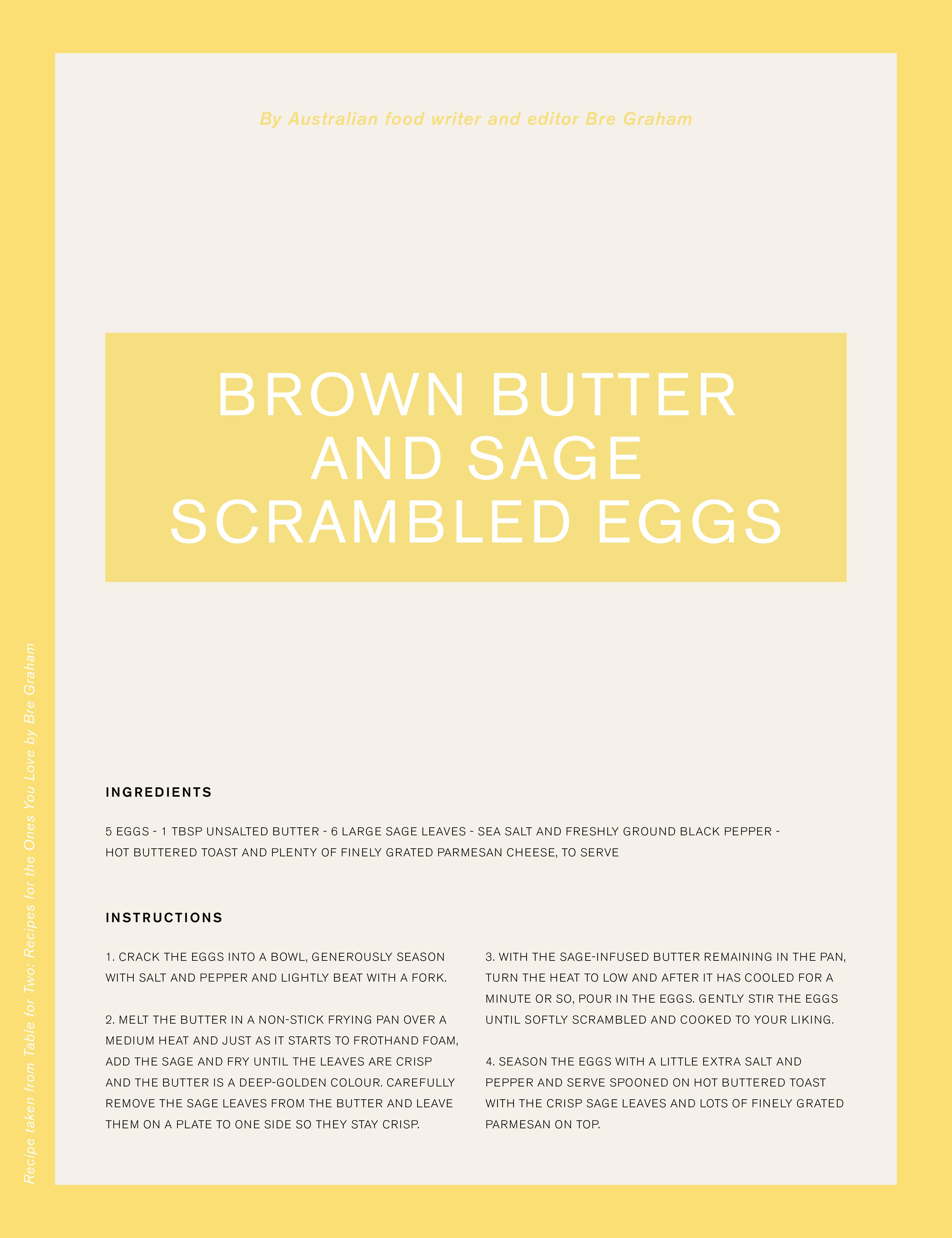 "When you cook in a kitchen that’s not your own, happy accidents can happen. One late Sunday morning in his small South London kitchen, I burnt some butter. I didn’t realize how hot his hob (cooktop) could get and, in a flash, the butter was spitting and frothing. The plan was to make us some simple scrambled eggs, but I like to see all accidents as opportunities and this one was no different. With just one mistake and a few herbs, this breakfast tasted like we had forked out a tenner for it at a posh cafe around the corner. It takes less than 5 minutes to make, yet once it’s topped with a cloud of grated Parmesan and curls of crisp sage, it looks like you could have started making it at sunrise."