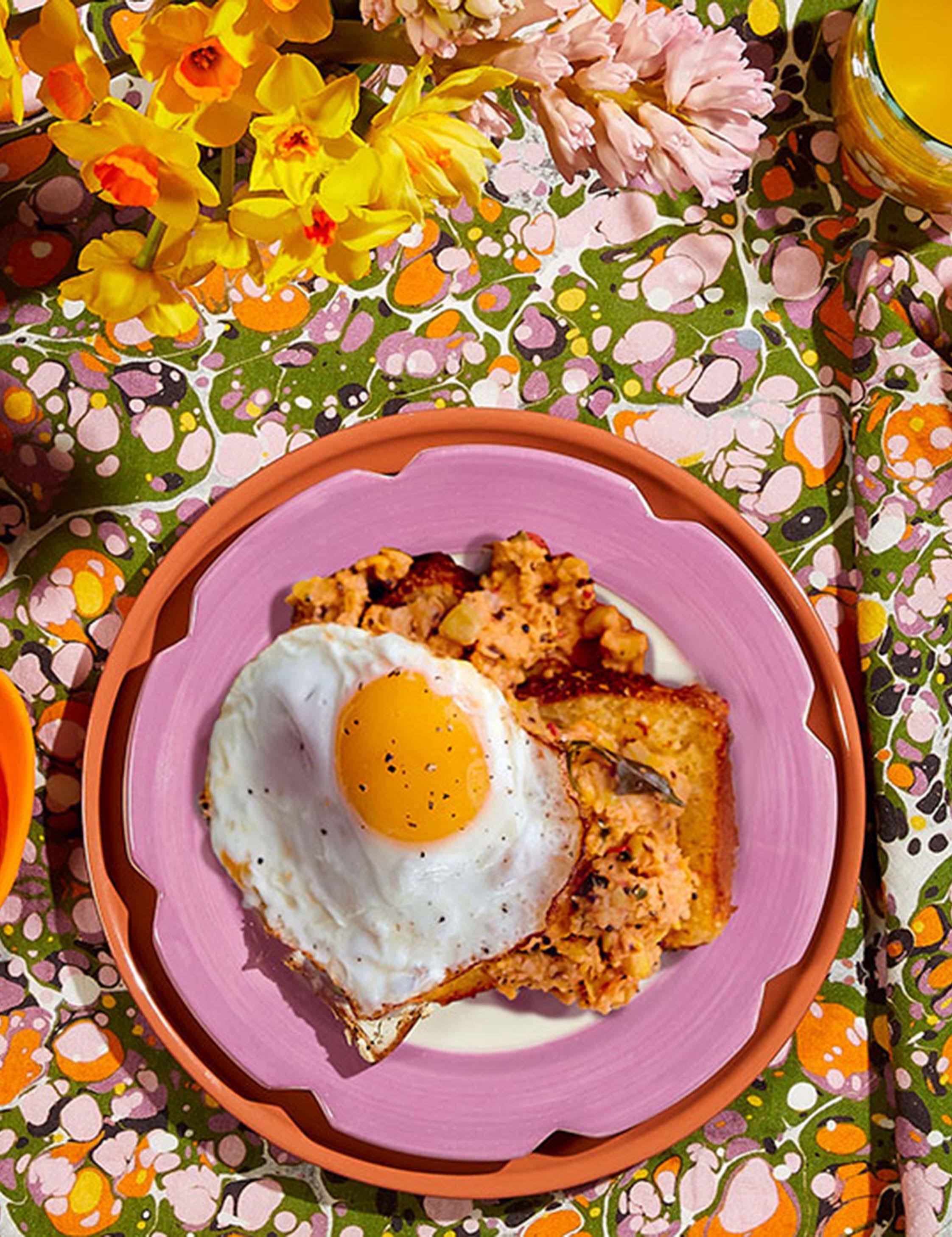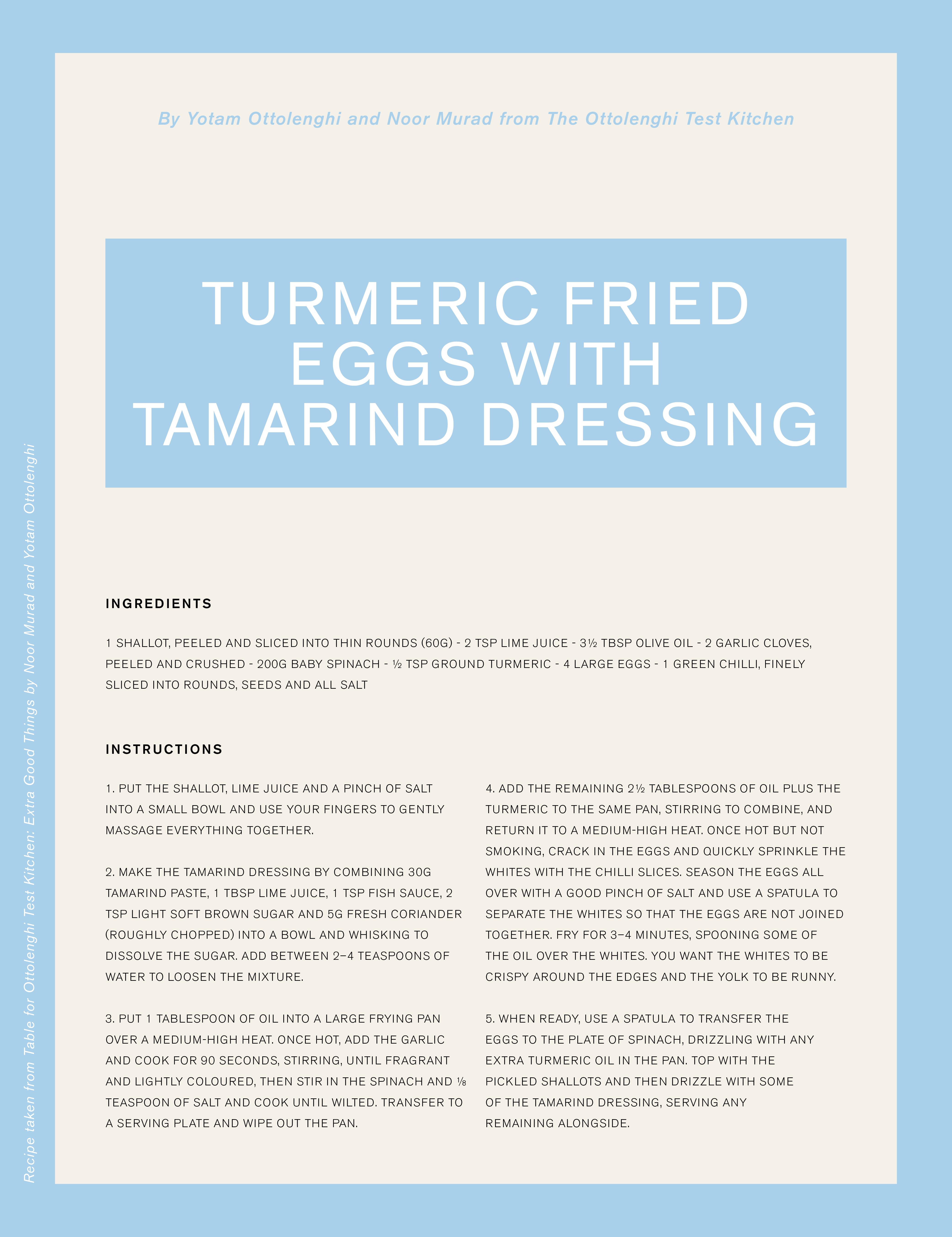 "These are fried eggs but with a very eccentric wardrobe, thanks to the turmeric and chilli, which make them as good to eat as they are to look at. You can serve this easy, vibrant breakfast as it is, or alongside a potato rösti, as part of a brunch spread."