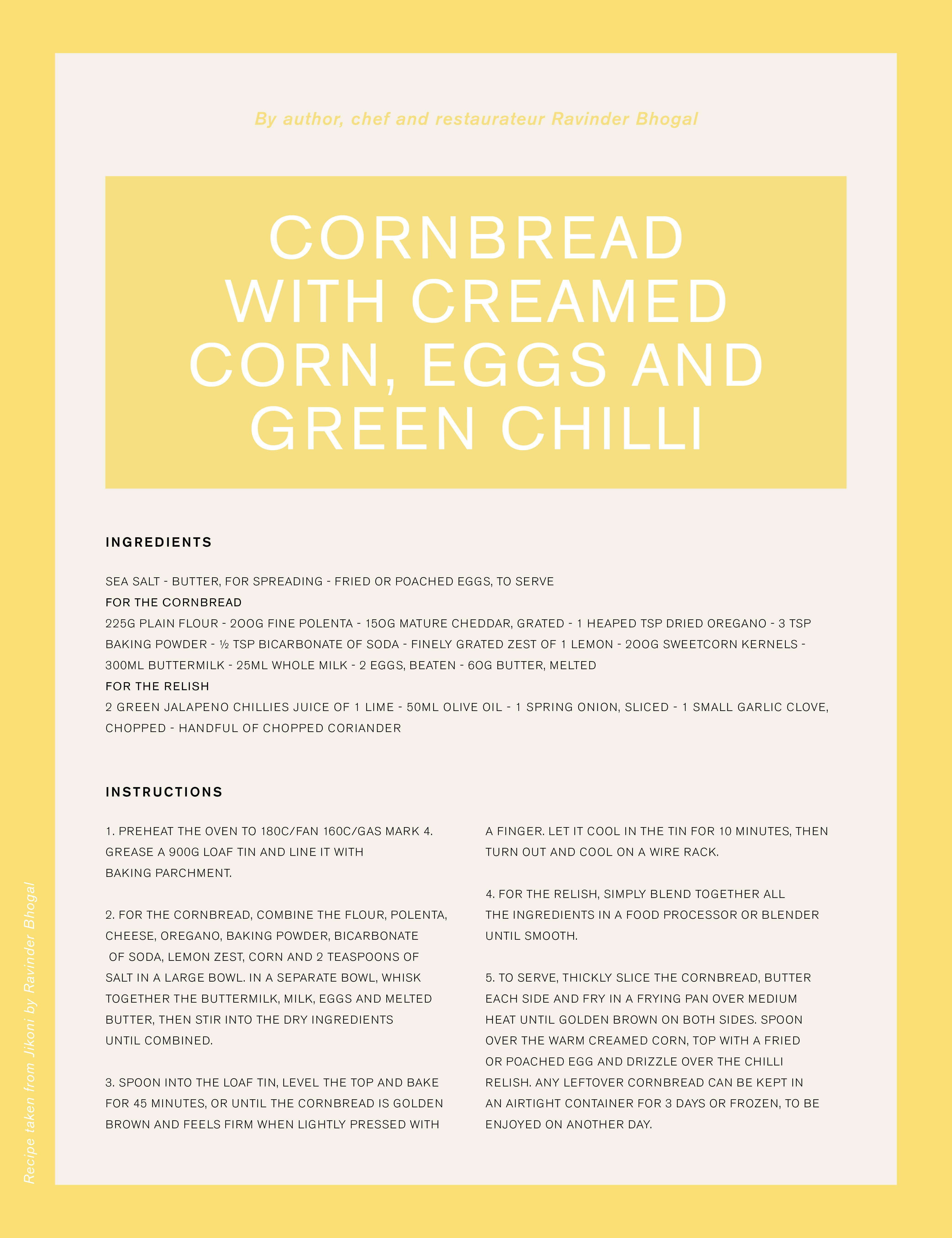 "This recipe (taken from my book, Jikoni) is really three recipes in one: the creamed corn can be eaten on toast, or is rather lovely on a jacket potato; equally, the cornbread makes for a great snack on its own pan-fried with a little butter; and the jalapeno relish is the perfect condiment to spice up anything, but especially eggs. If you can’t get fresh corn, just use frozen or tinned."