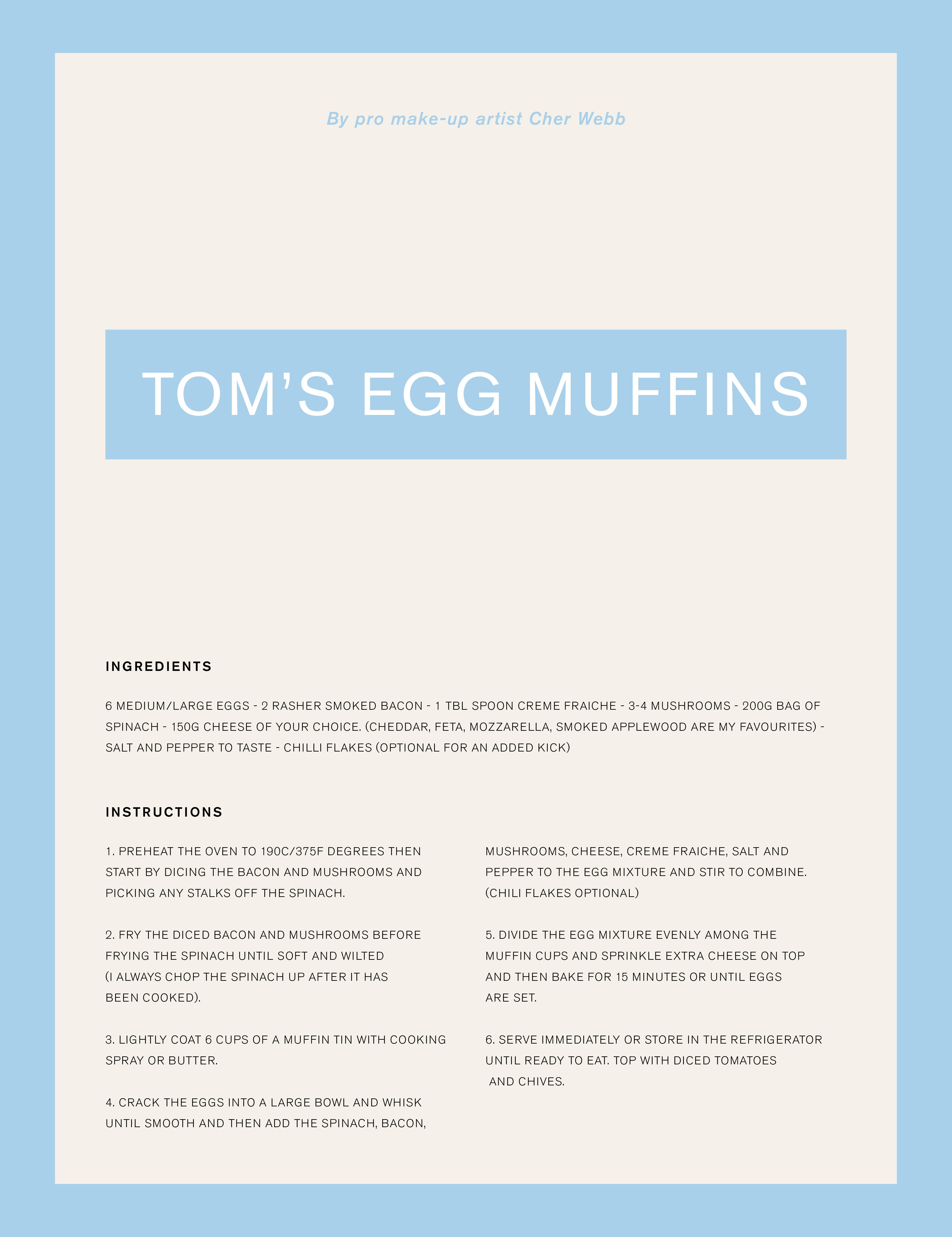 "My boyfriend Tom’s signature egg recipe is a big favourite in our household so we always have a tub of them in the fridge. Healthy, full of veg and protein and a great snack in about 20 minutes, but they last for up to four days. Absolute crowd pleaser! All you need is a few ingredients and a muffin baking tray."