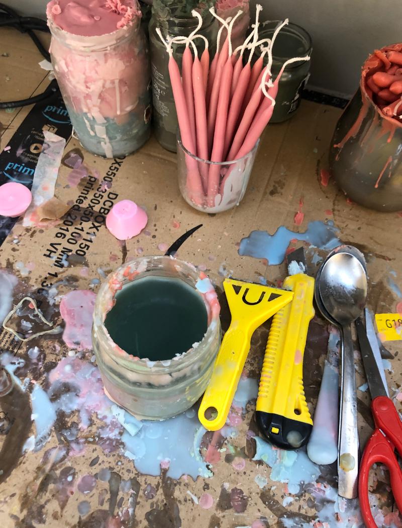 The candle making process starts with choosing a colour. I gather my soy wax dyes and rub them along rough paper so I can see what the dyes will look like. I then grab some other dyes and mix them on the paper until I find my perfect shade. I usually have a good idea of the colour I’m looking to achieve and who it's inspired by. I refer to photographs of friends, family, landscapes, and clothing to create each unique shade.