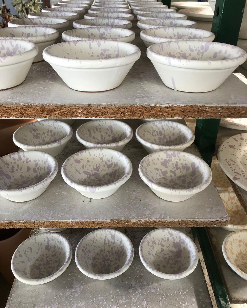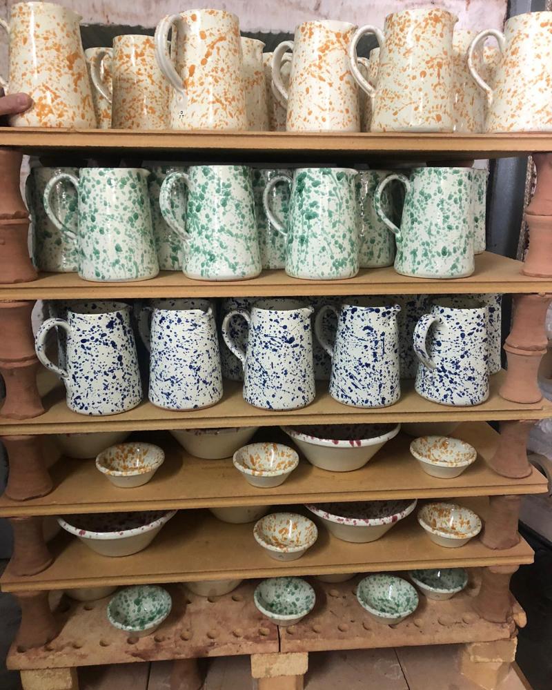 “Once the goods have cooled down, they are hand-dipped in the background glaze colour and left to dry. When the drying process is complete, each piece is hand-splattered before going back into the kiln. After another eight hours in the hot oven, the ceramics are ready. They are then shelved to cool, quality checked and packed to send to us here in London.”