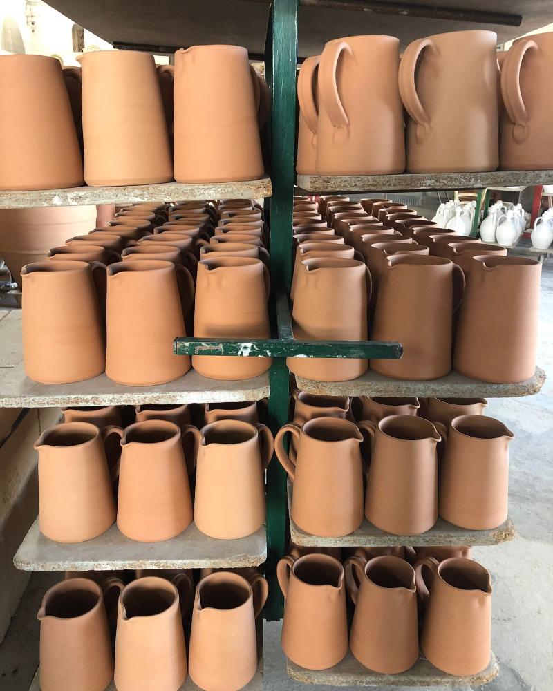 “Some of our items are punched out of lumps of clay, which are then shaped by hand for an organic quality, while others are hand-spun on the pottery wheel. The finished shapes are then usually taken outside to dry in the sun. The warmth of the sun draws moisture from the raw material which prevents cracks in the ceramic from forming in the oven. The shapes are then fired in the oven at around 1,200 degrees for eight hours.”