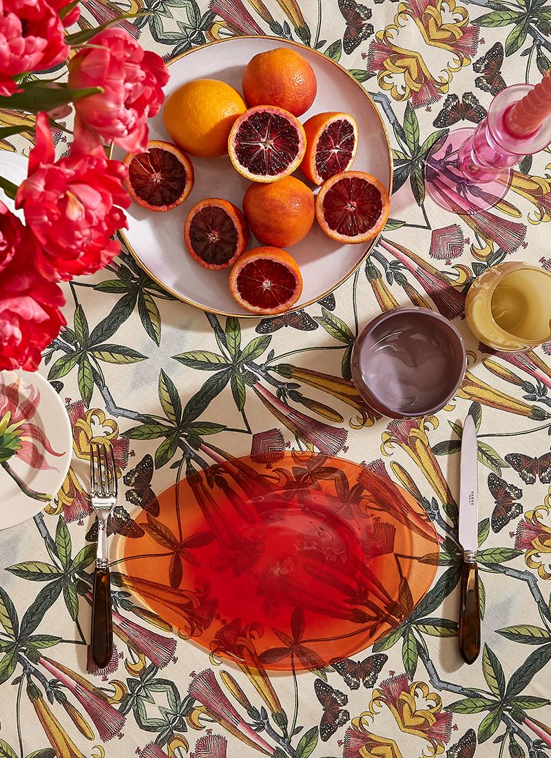 Shop TablewareThe honeysuckle print by Patch NY from Avenida is the perfect backdrop for the sugary and creamy glass from Helle Mardahl. Paired with the intensity of the season’s best tulips and blood orange, it’s a winning combination with a new twist of pink and green.