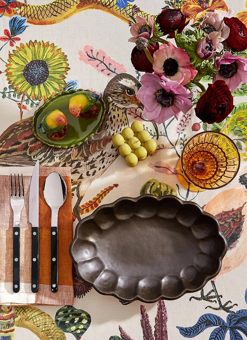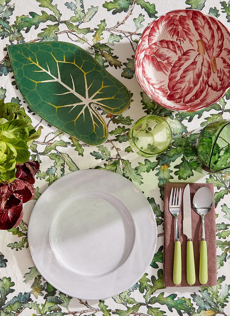 Shop TablewareWhen you want to go green and lean, build your table with leafy ceramics from Astier de Villatte and this radicchio bowl, set against the oak leaf Thyme tablecloth. For pureness, add the whitest of white of an Astier de Villatte plate.