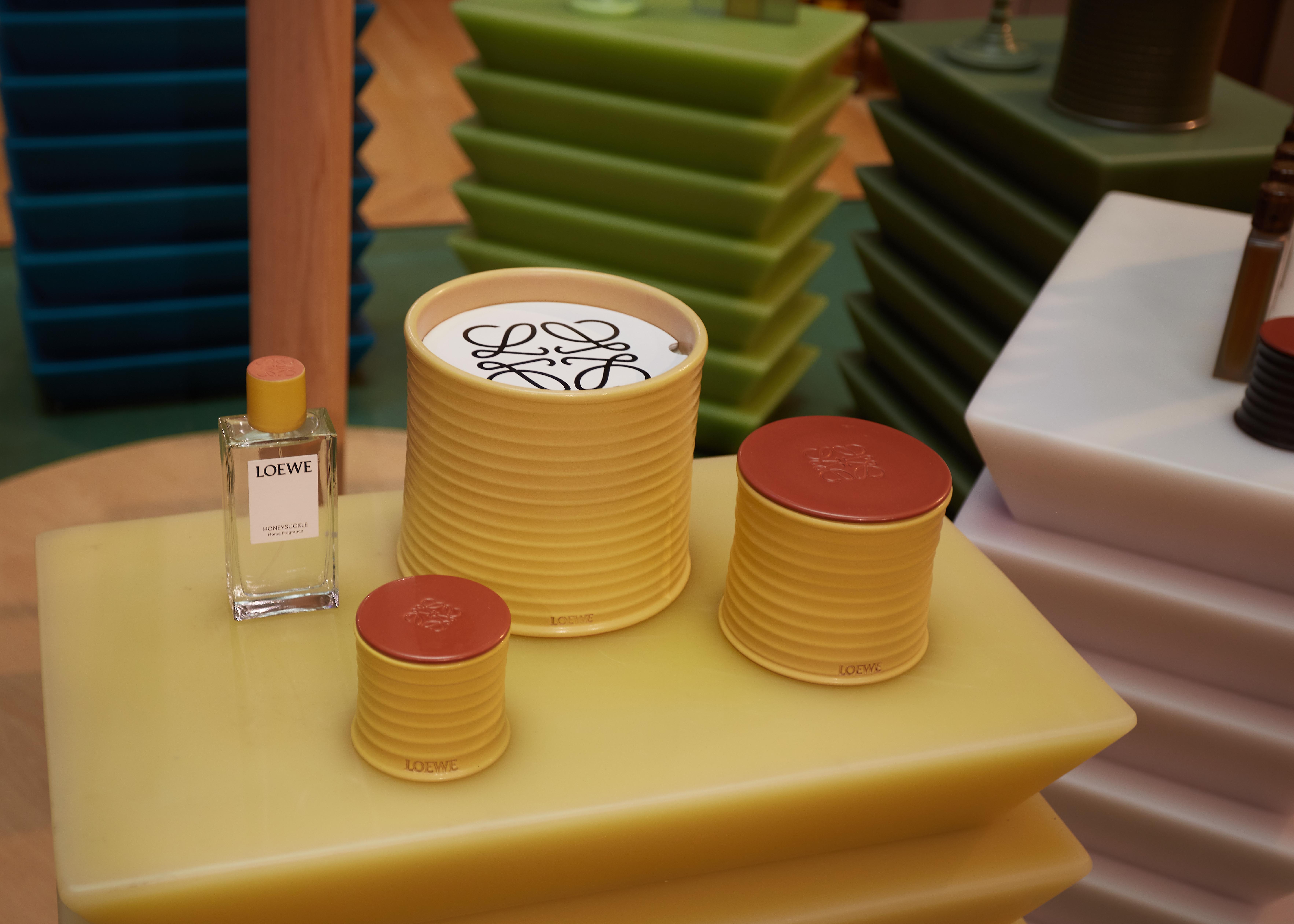 Visit The Atrium in Liberty London, and you’ll be greeted with a kaleidoscopic new candle display by Spanish house Loewe. Overhead, candles hang from an octagonal wooden structure, as if drying in a traditional wax workshop. Each side of the octagon is dedicated to one of the house’s signature scents, including Ivy, Beetroot, Incense, Roasted Hazelnut, Honeysuckle, Tomato Leaves, Cypress Balls, Wasabi and Mushroom. Beneath the hanging wax, colourful, sculptural plinths display room sprays, fragrances and ceramic candles in various sizes.