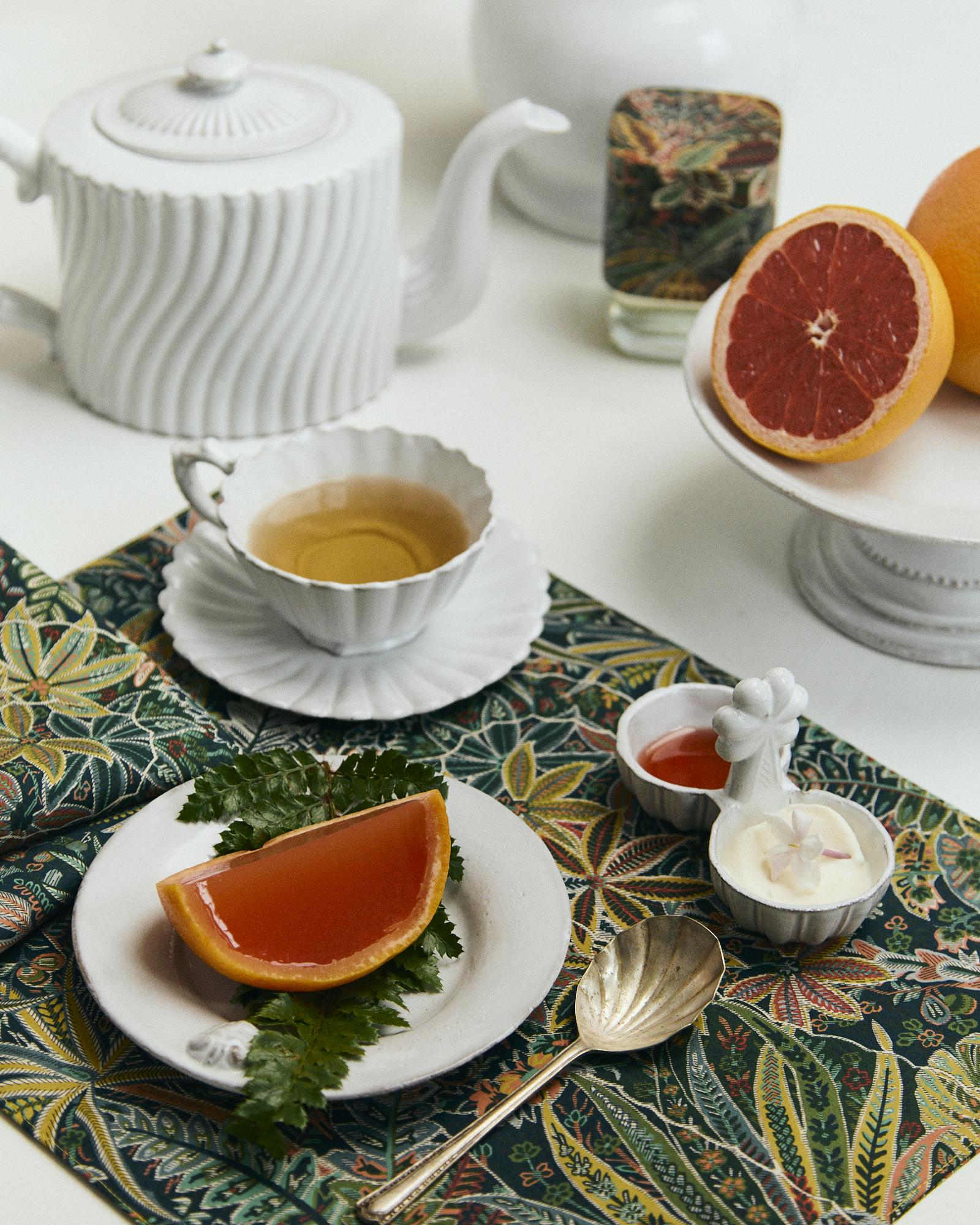 I chose Astier De Villatte tableware, which is all white and carries a nostalgic yet elegant feel. The pieces have a subtle playfulness to them. I used a placemat and napkin in the Adelphi Voyage print, also the inspiration for the Adelphi Sun fragrance.