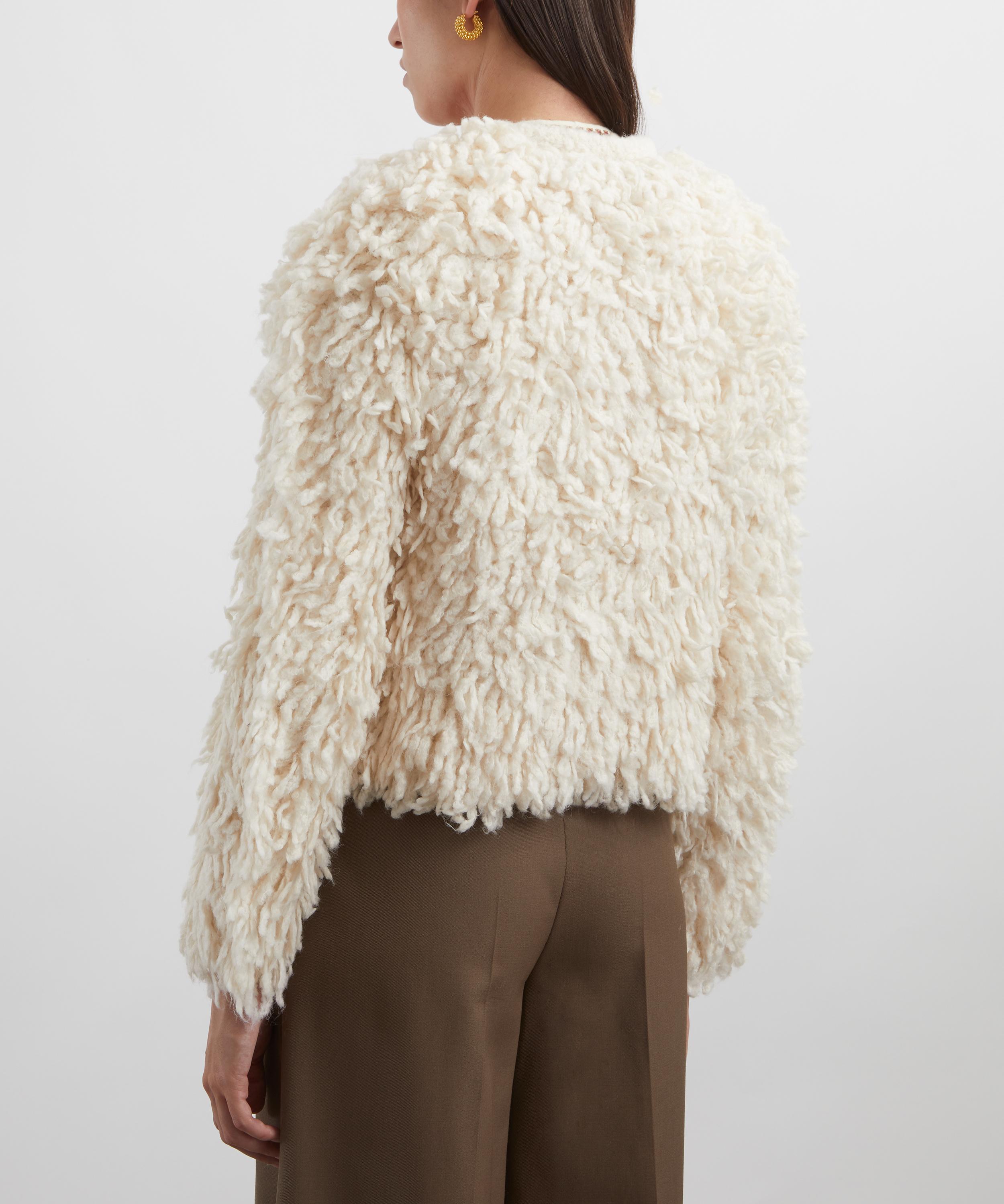 Crafted from a plush alpaca-wool blend with a tactile, fur-like finish, the Fedra Jacket features a cropped silhouette with a round neckline, long sleeves, and a concealed hook placket for a sleek, elegant look.