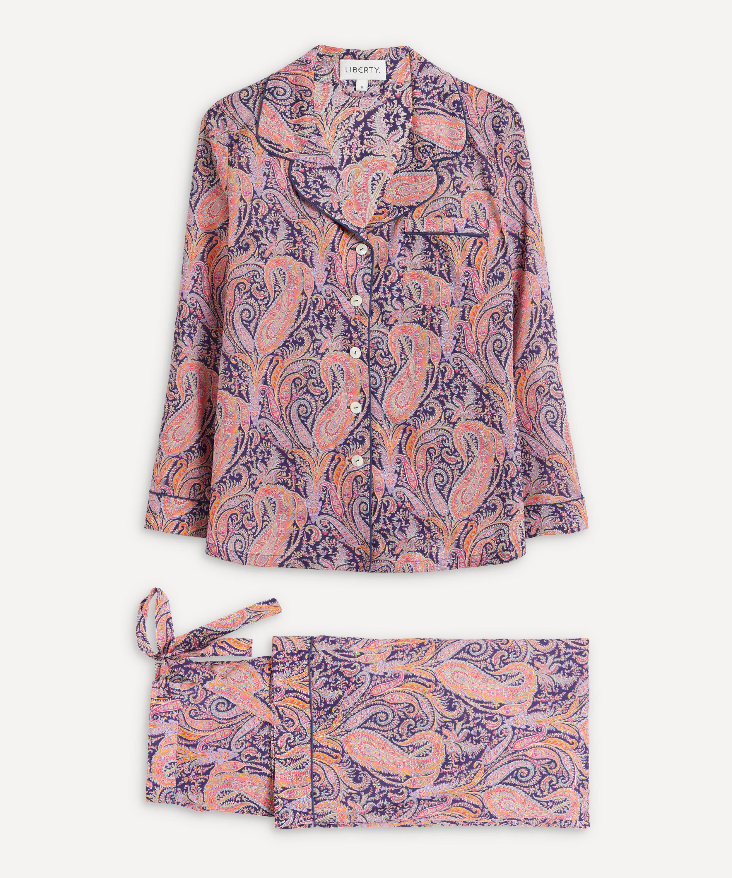 The long-sleeved pyjama set is crafted from Tana, a breathable and fluid revelation of a fabric that we’ve been perfecting for over a century, prized for its colour-rich surface and ultra-soft hand-feel. Featuring piped trims and mother-of-pearl buttons, the set spotlights our Felix and Isabelle print – inspired by an 1850s shawl found in the Liberty archive, elements were drawn from its paisley layout and reimagined in the studio into a completely new design.
