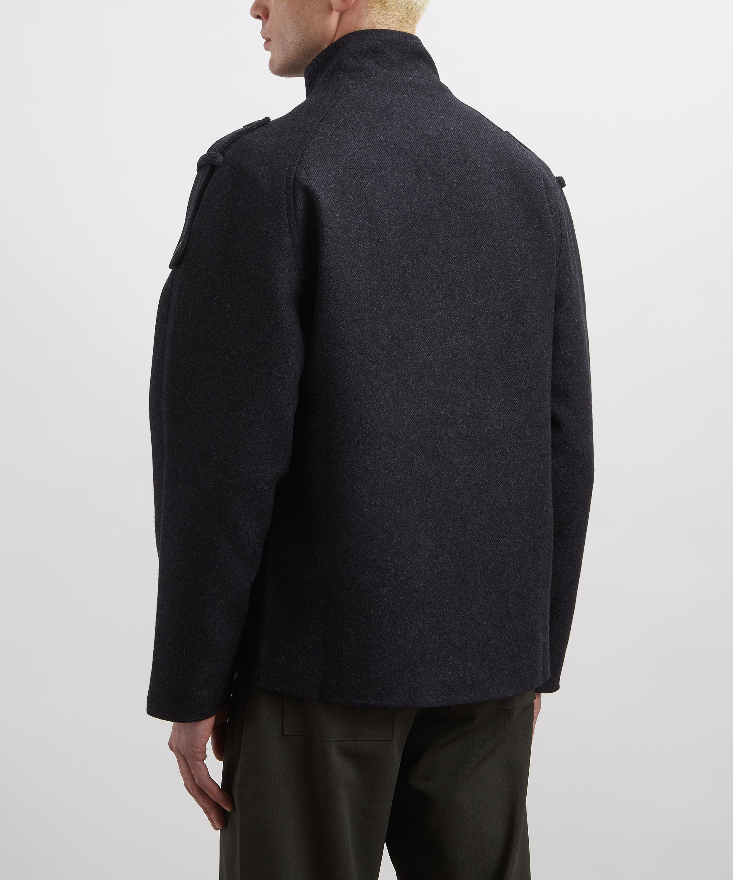 Rooted in classic utilitarian codes, this wool jacket is defined by a funnel neck, raglan sleeves, a concealed button placket and practical side pockets. Shoulder-tab detailing completes the piece, highlighting the brand’s considered approach to function and form.