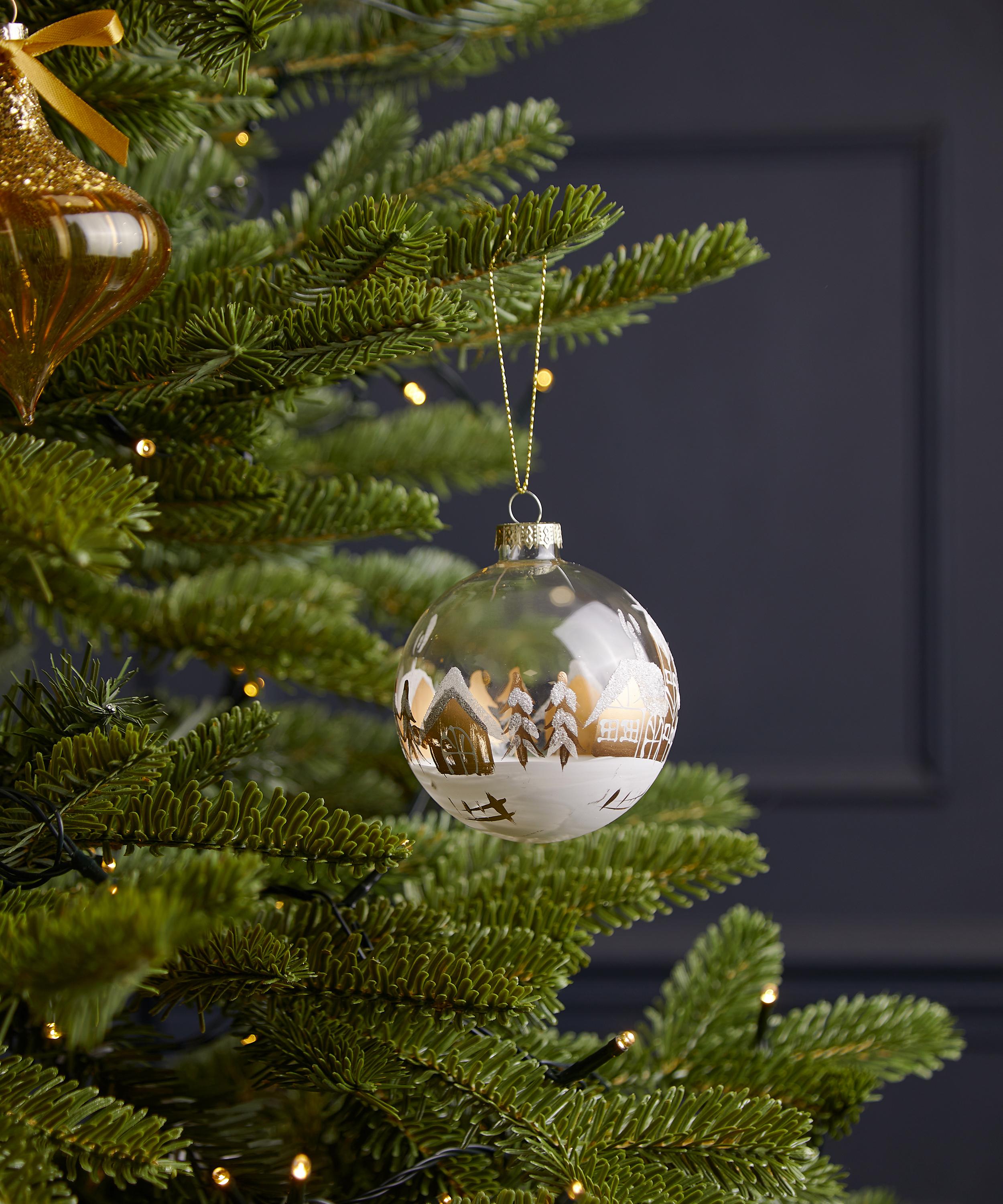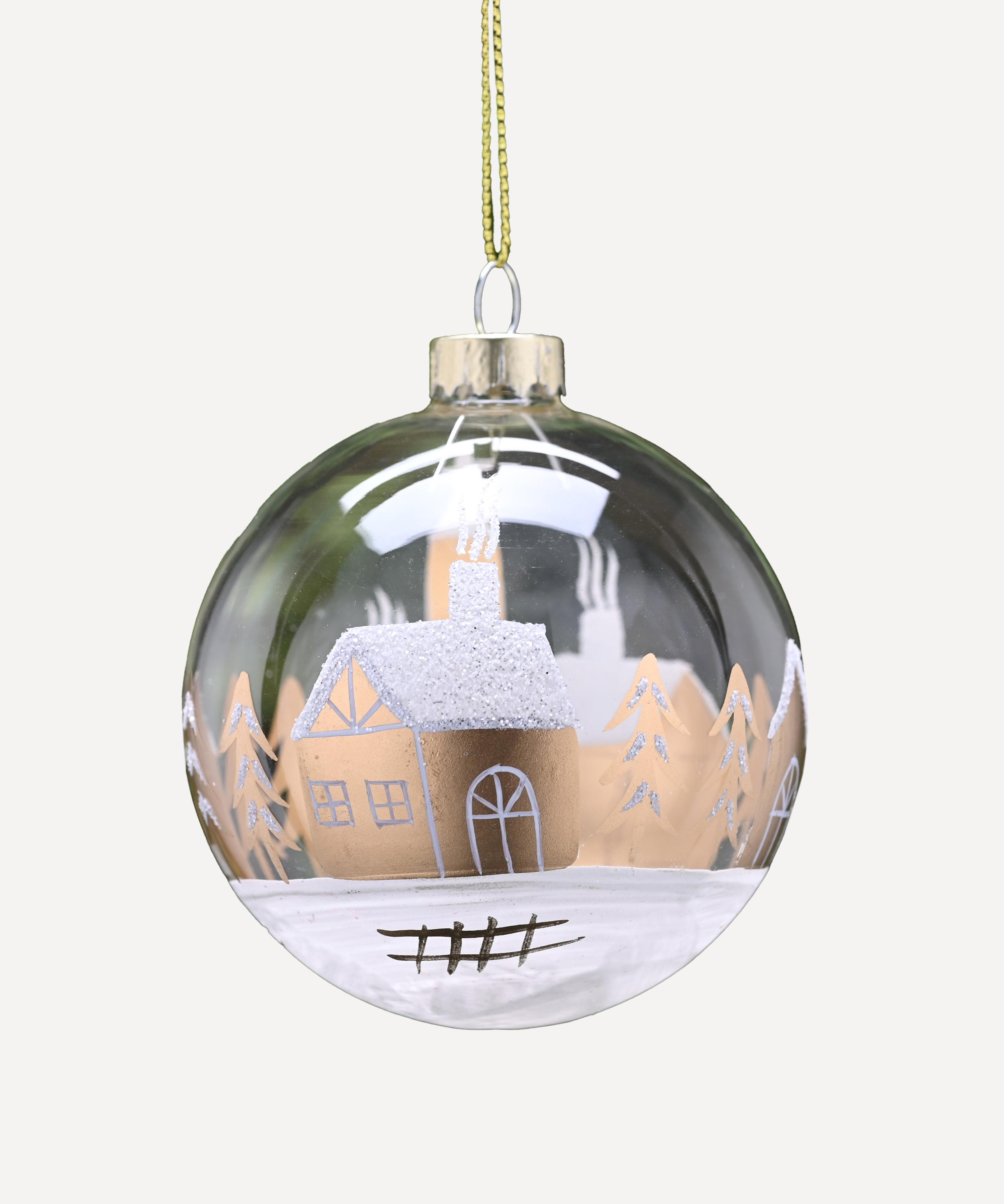 Expertly crafted from glass, it’s defined by a gold and white festive scene depicting a snow-topped house – ideal for adding a note of holiday sparkle to your decorations. Pair it with your traditional and contemporary baubles and adornments for maximum Christmas flair.About Christmas