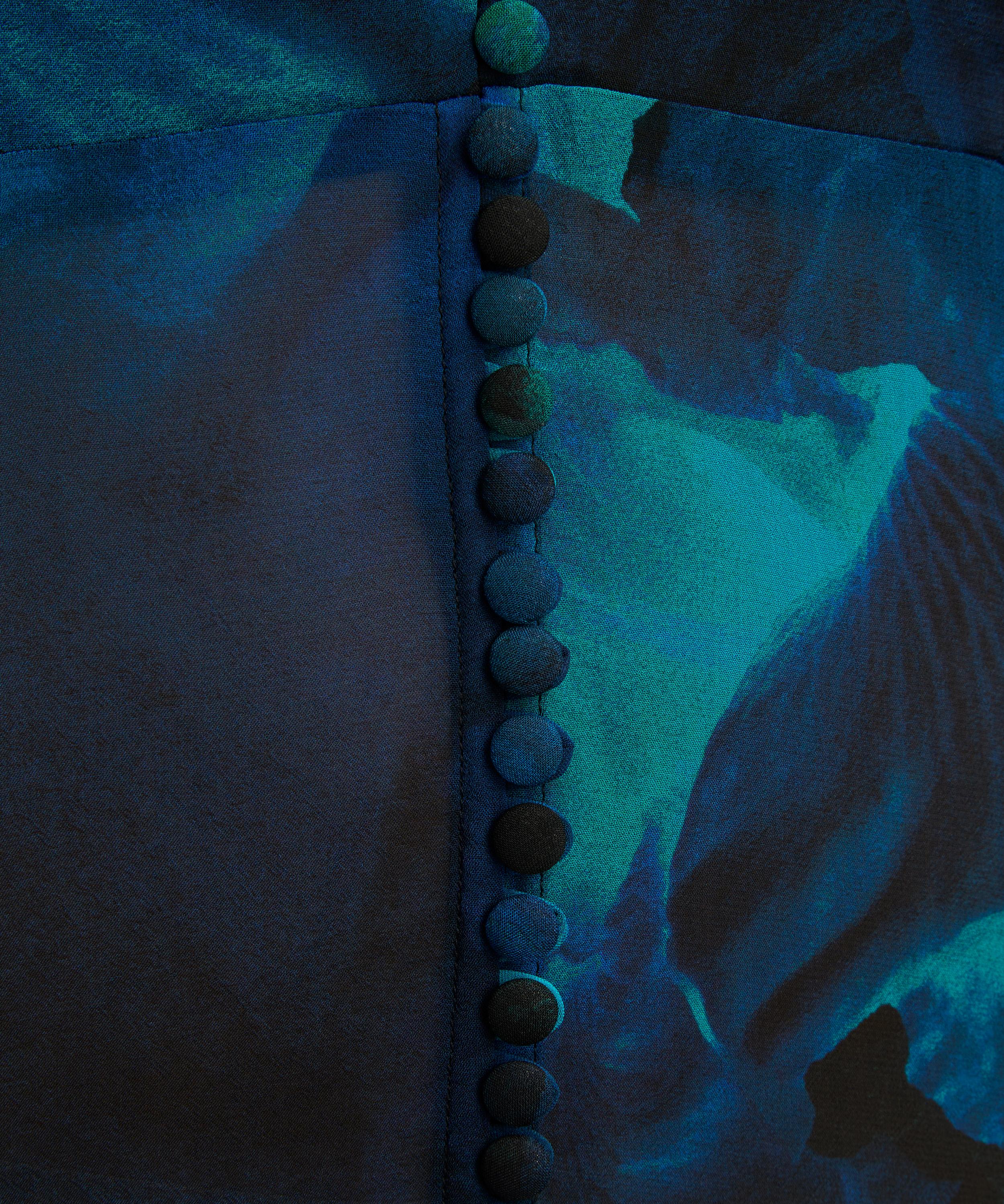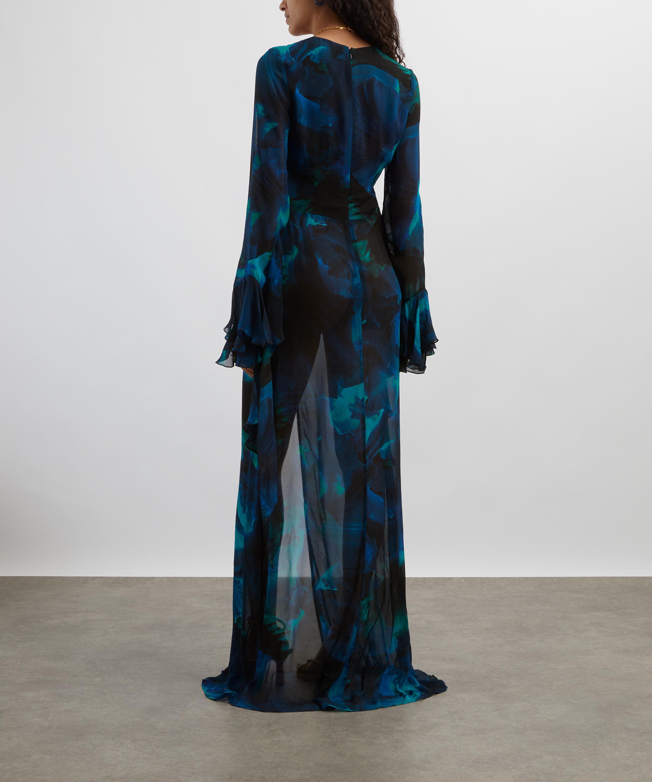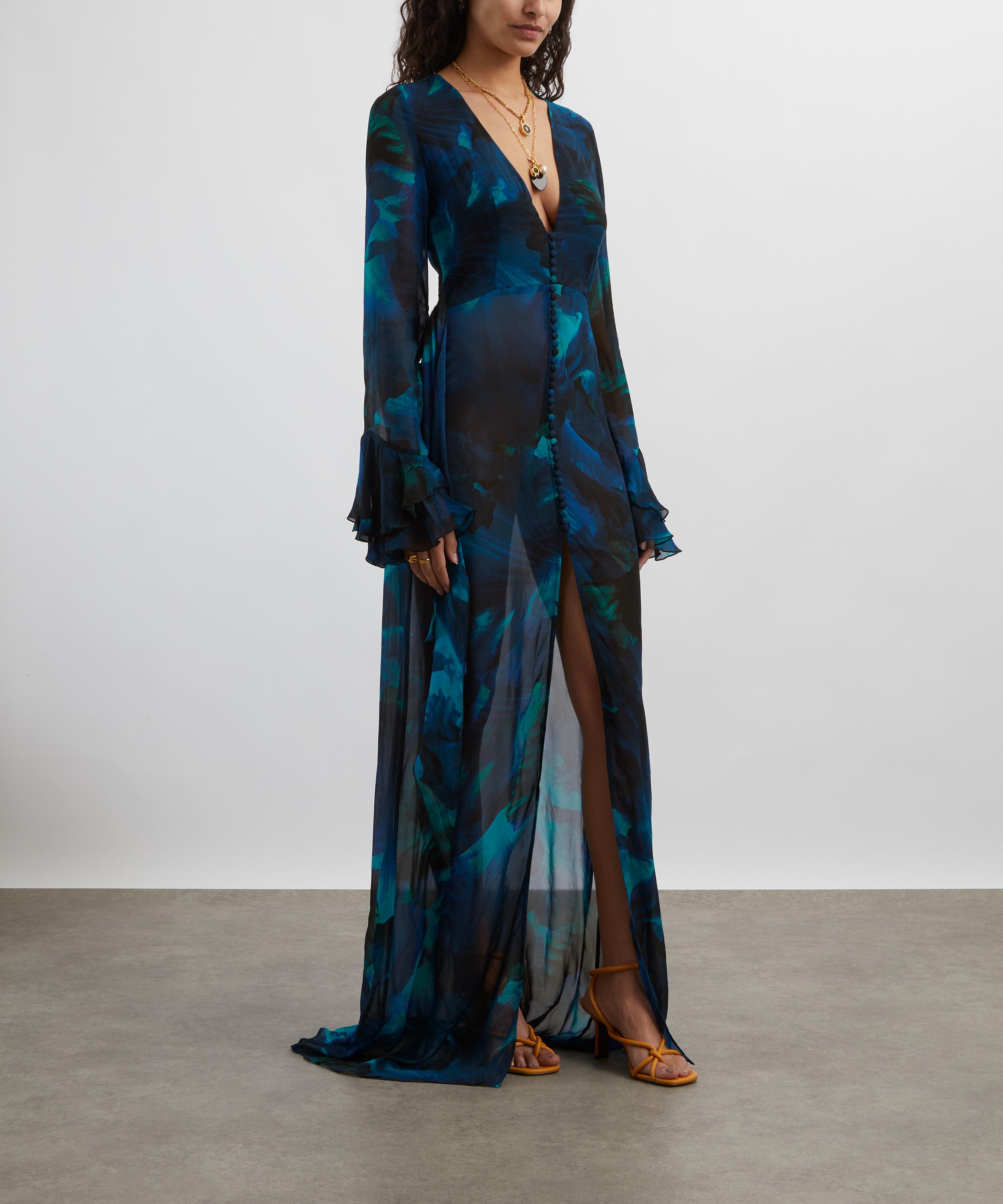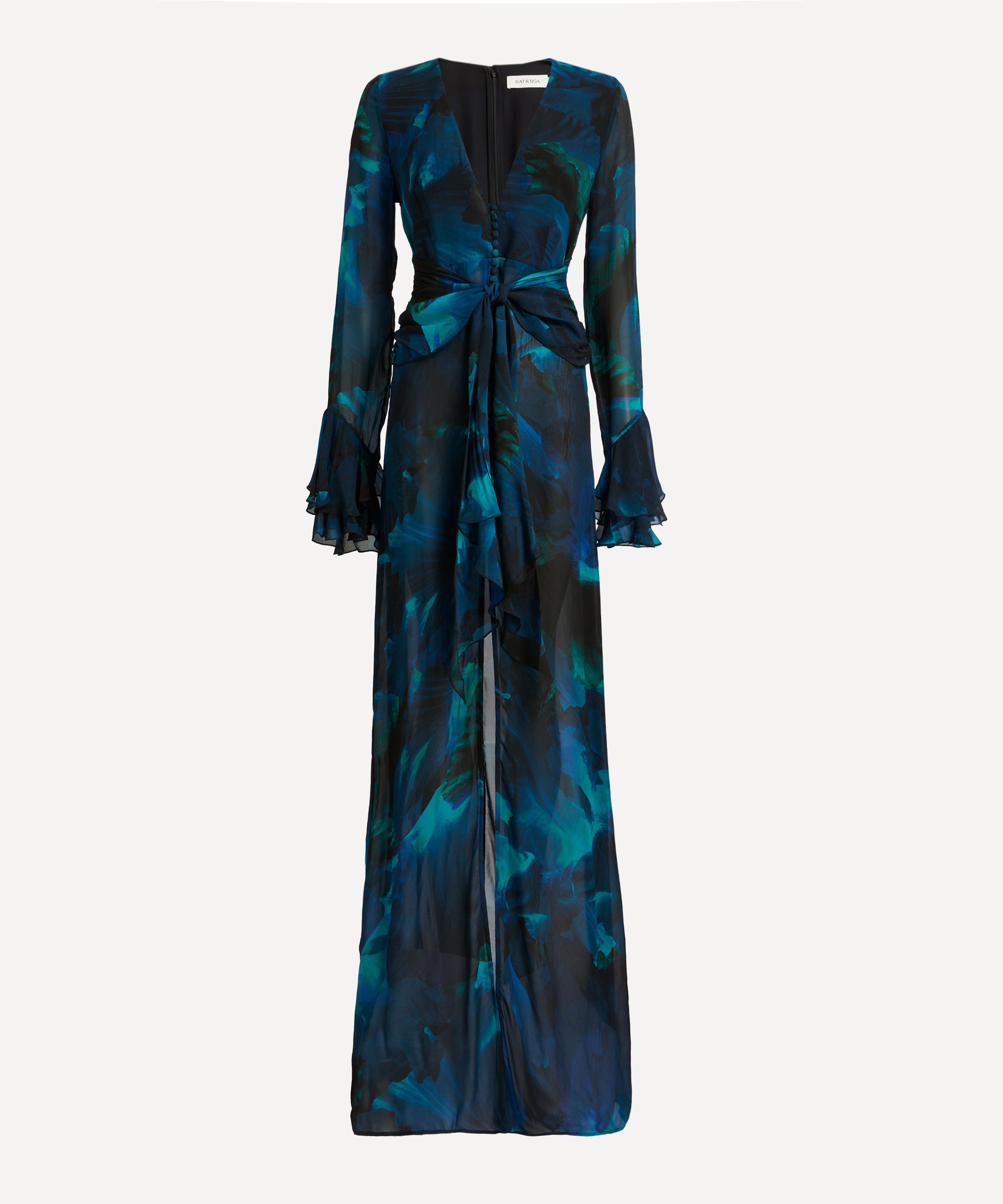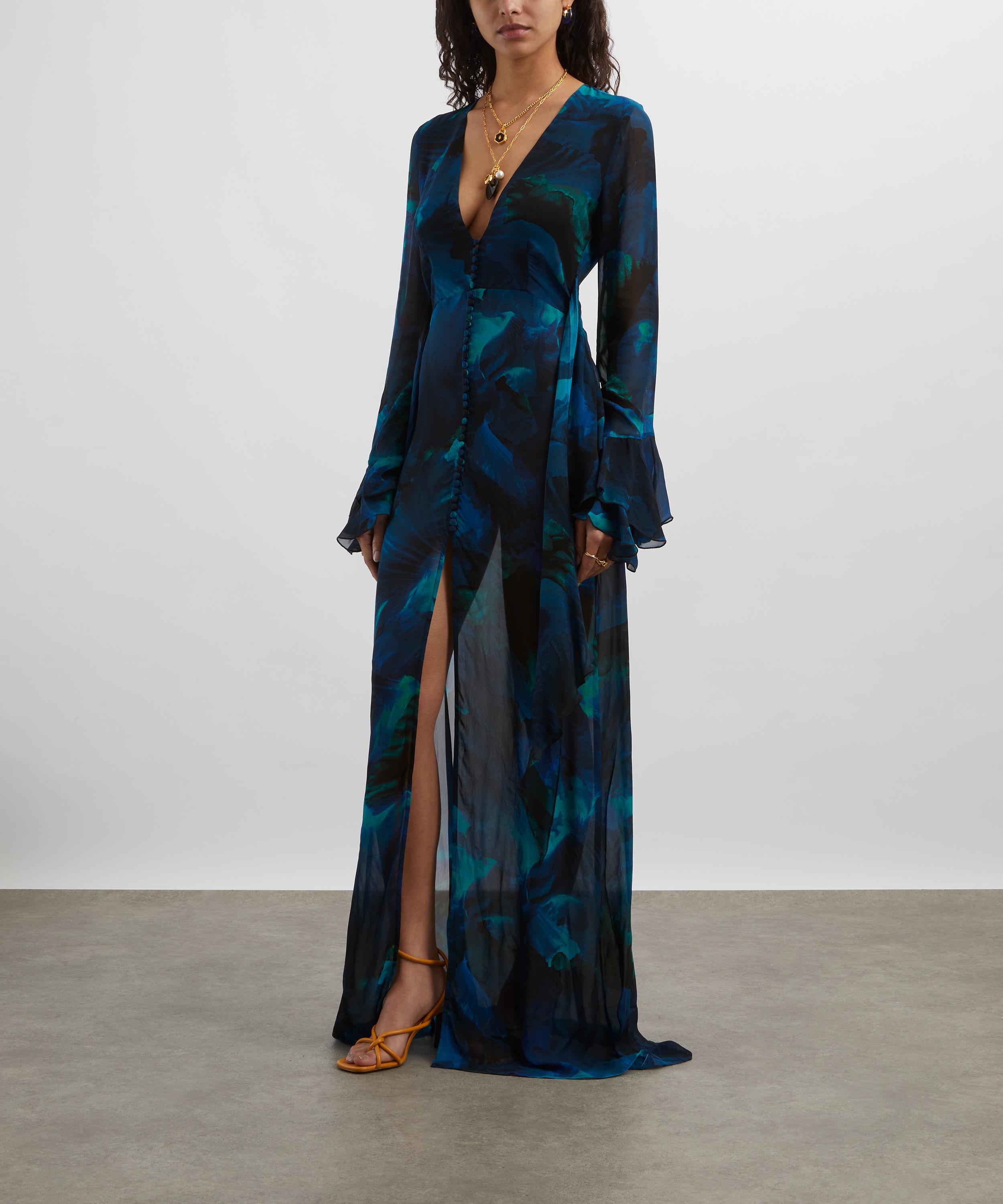 Crafted from semi-sheer viscose georgette and emblazoned with an abstract blue floral print, this maxi dress exudes sophistication with its plunging V-neckline, flattering waist wrap, and long, slim sleeves complete with frilled cuffs.